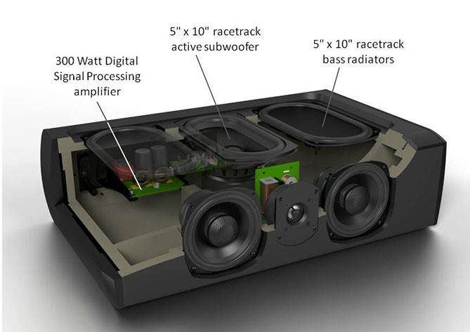 • Speaker Enclosure: Internally Braced with Top Mounted Powered Subwoofer and Two Pressure Coupled Low Bass Radiators