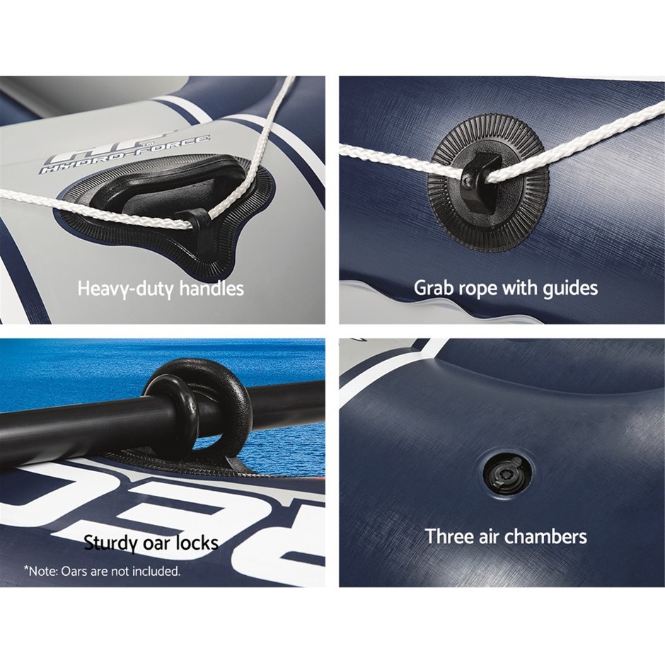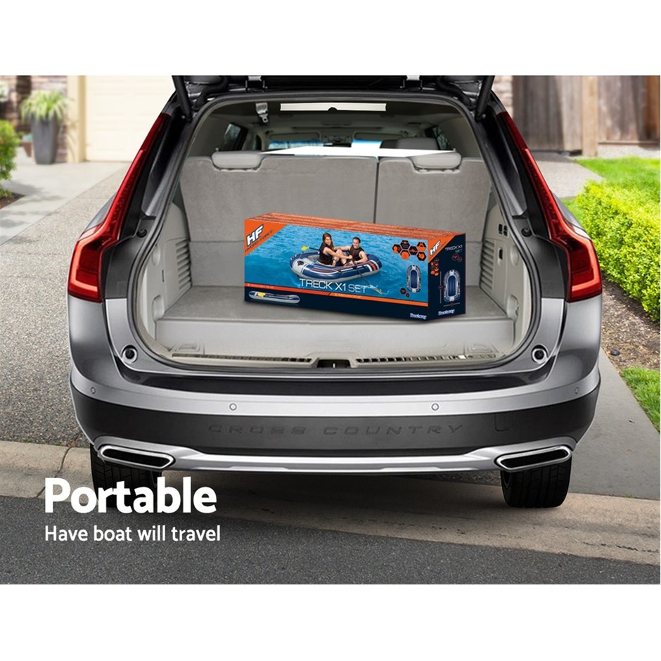 Features TRECK X1 3 air chambers Interlocking quick release valves Safety valves Sturdy pre-tested vinyl Grab rope with guides Inflatable floor Inflatable seat cushions Heavy-duty handle Rowlocks Tow ring Heavy-duty repair patch included