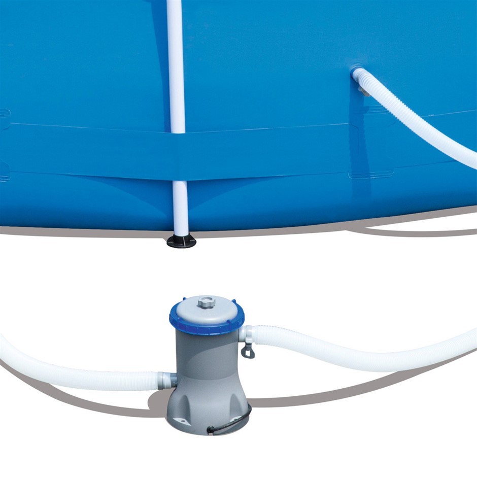 Features * Bestway Steel Pro Frame Pool * Easy set up, just add water and enjoy * Rust-resistant metal frames * Heavy-duty PVC and polyester 3-ply side walls * Built-in flow control drain valve * Easy to drain by attaching the valve to a garden hose (with included adapter) * Underwater adhesive repair patch * Semi-permanent structure, standing strong all summer long * Ample space for everyone * Bonus filter pump with cartridge, hoses and attachments * CB, EMC, LVD, SAA, S-mark certified