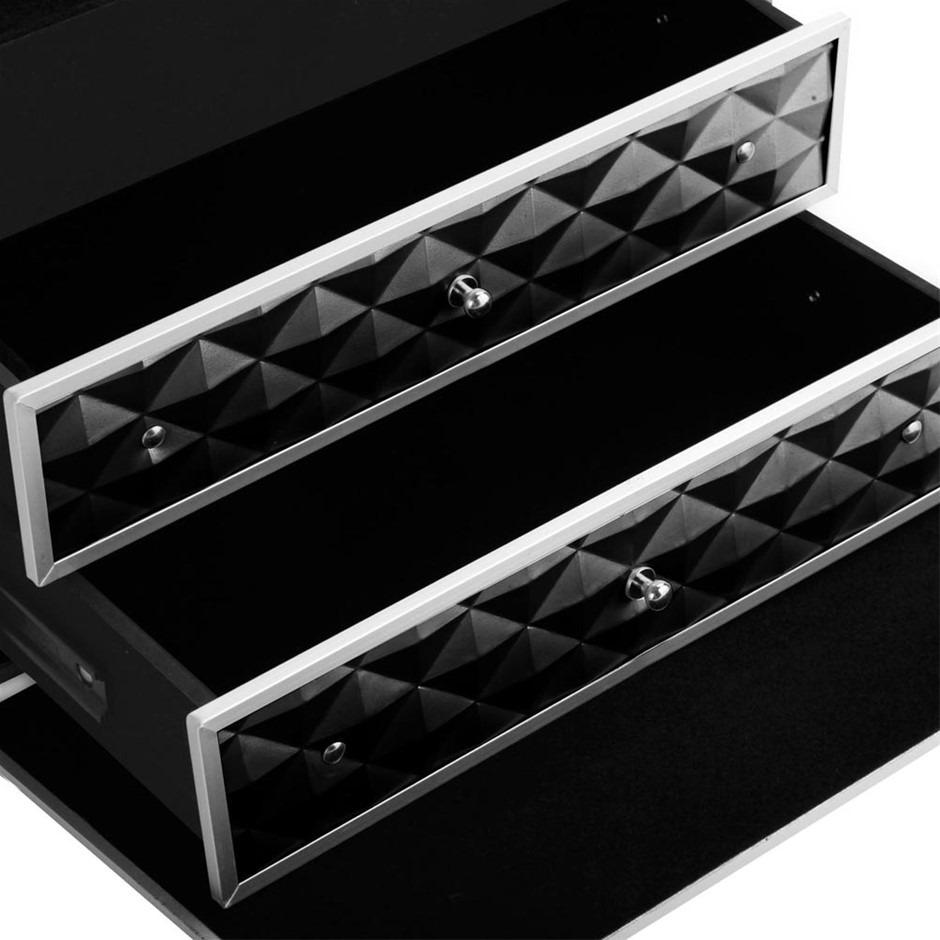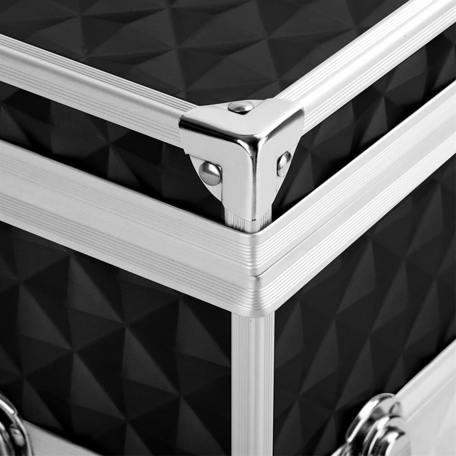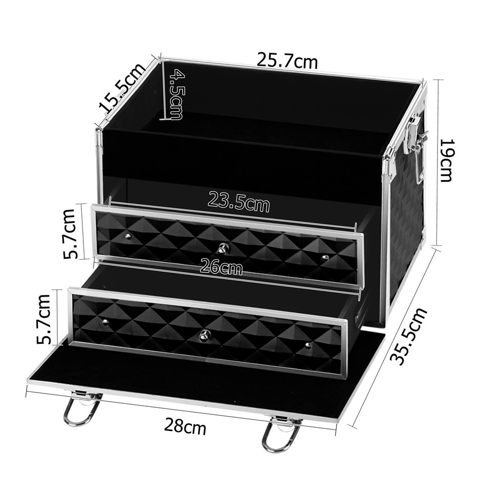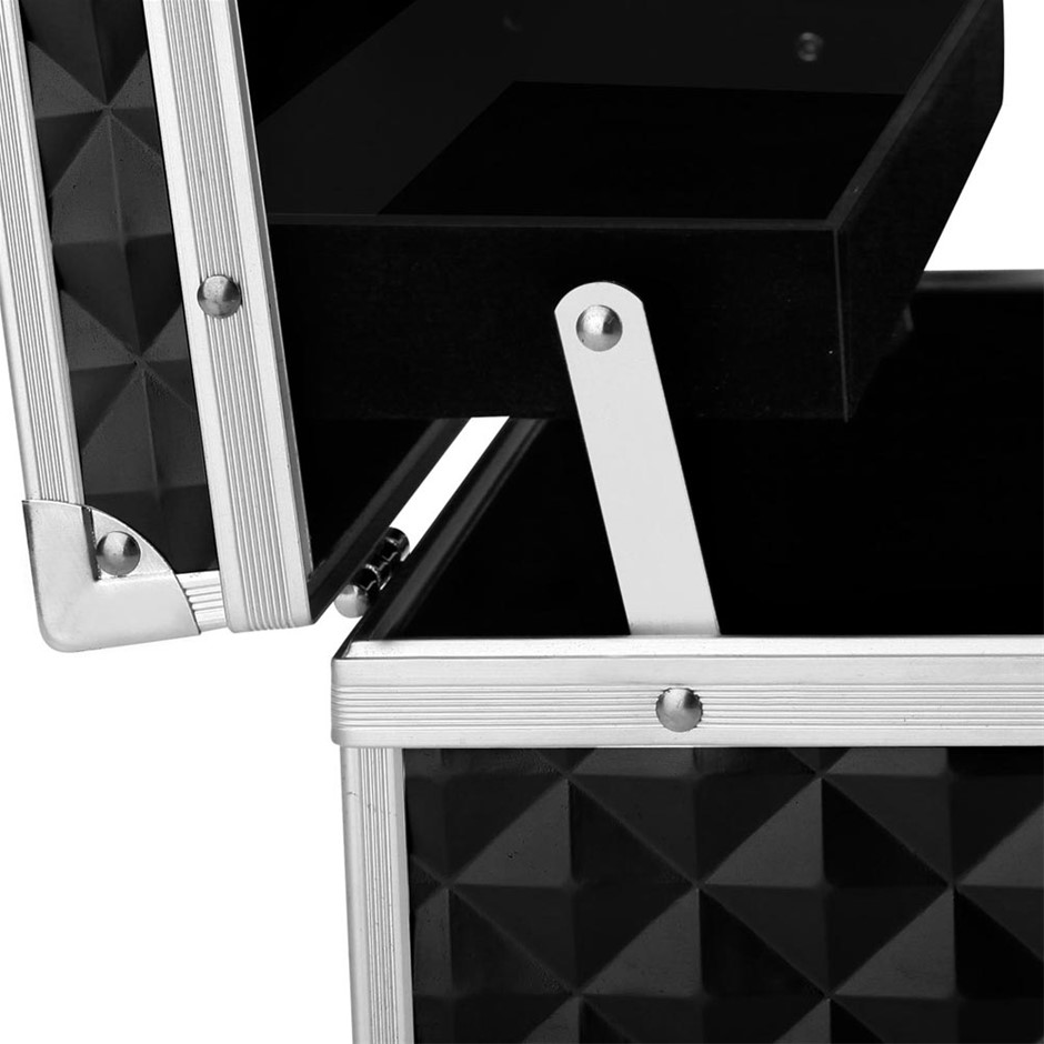 * Professional beauty case*Grade-A aluminium frame & hinges*Elegant black velvet interior lining*2 delicate sliding trays with open top section*2 level spacious section on top case