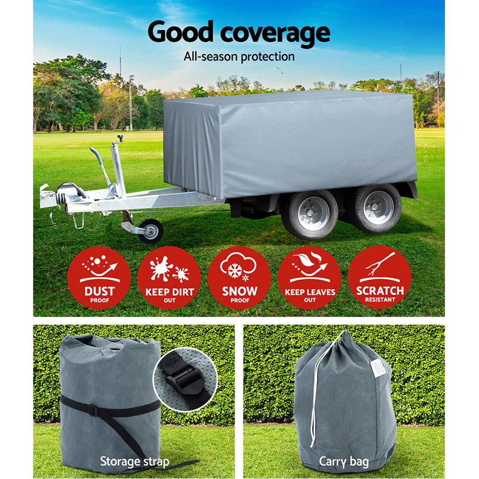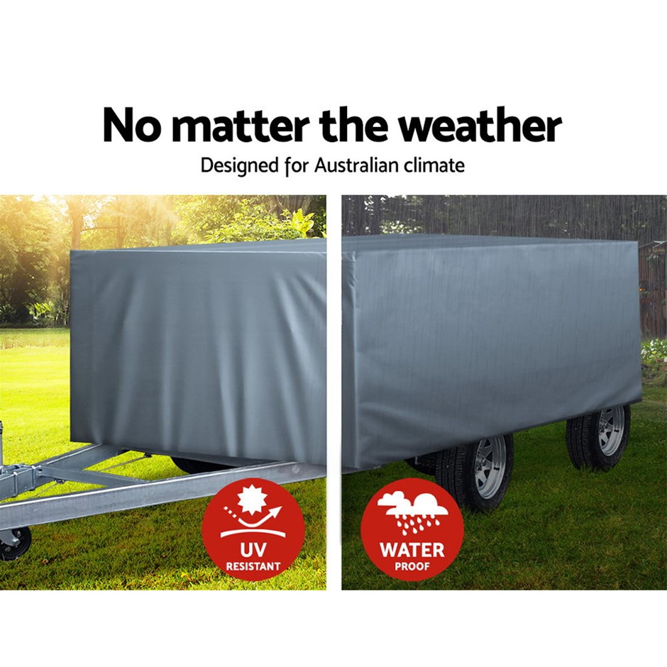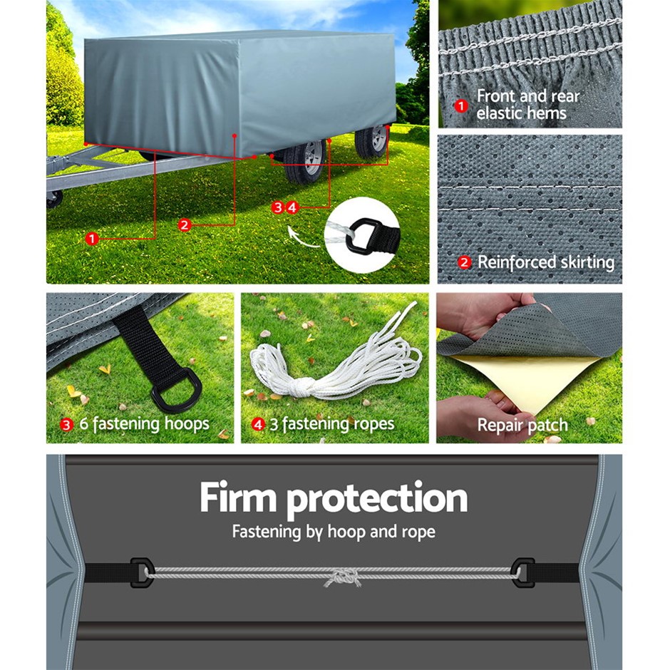 The Weisshorn Camper Trailer Cover is the perfect protection for your camper trailer and more. Constructed of a 3-ply non-woven material, the cover is strong, durable and breathable. It is totally waterproof, UV-resistant and mildew-proof too. The elastic skirting is also reinforced with quality stitching work. The cover can be used for trailer between 8ft and 10ft and can be easily installed with a hassle-free hoop and loop fastening. Also included is a repair patch and carry bag for easy storage.