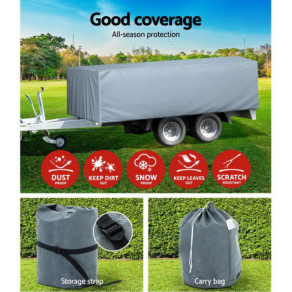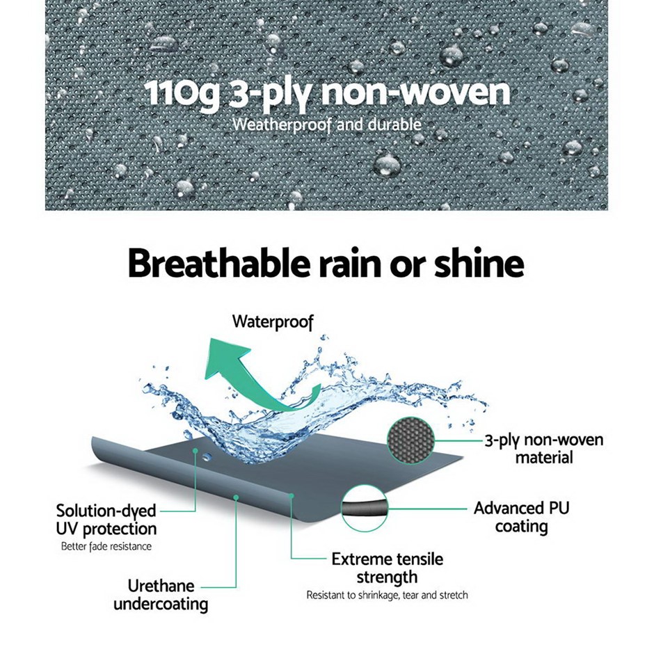 The Weisshorn Camper Trailer Cover is the perfect protection for your camper trailer and more. Constructed of a 3-ply non-woven material, the cover is strong, durable and breathable. It is totally waterproof, UV-resistant and mildew-proof too. The elastic skirting is also reinforced with quality stitching work. The cover can be used for trailer between 12ft and 14ft and can be easily installed with a hassle-free hoop and loop fastening. Also included is a repair patch and carry bag for easy storage.