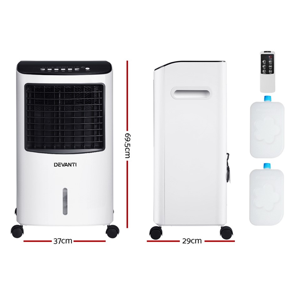 Specifications: Brand: Devanti Power: 65W Voltage: 220V – 240V, 50Hz Air flow volume: 400m³/h Humidify capacity: 0.5-1L/h Tank volume: 8L Cooling mode: Sleep, normal, natural Noise: <60dB Included: 2 ice bricks with ice crystals Overall dimensions: 37cm x 29cm x 70cm Colour: Black and white Assembly required: No Number of packages: 1