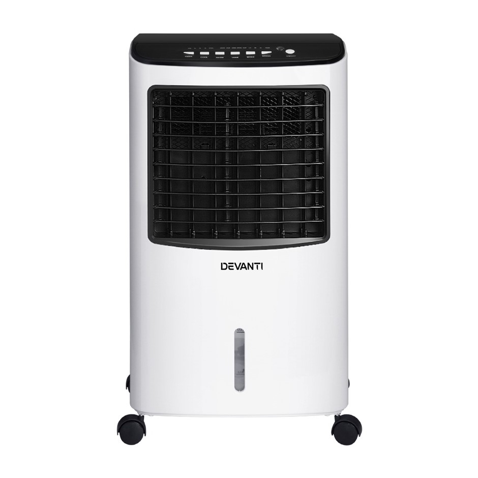 Our Devanti Evaporative Air Cooler is an air cooler and humidifier rolled into one compact and stylish machine. To use it as an air cooler, simply prepare the included ice crystals according to instructions, leave it in the 8L water tank and turn on the evaporative cooler to get super cool breezes throughout the room with its adjustable louvres and oscillation. The removable filters and the built-in ioniser together effectively eliminate all pollutants such as dust, pollen, cigarette smoke, bacteria and odours, to deliver purified air. The evaporative air cooler utilises a 3-speed fan with three working modes (normal, natural and sleep), and is fitted with four castor wheels for easy mobility. Not least, the button control panel enables easy operation, with a remote control included for extra convenience.