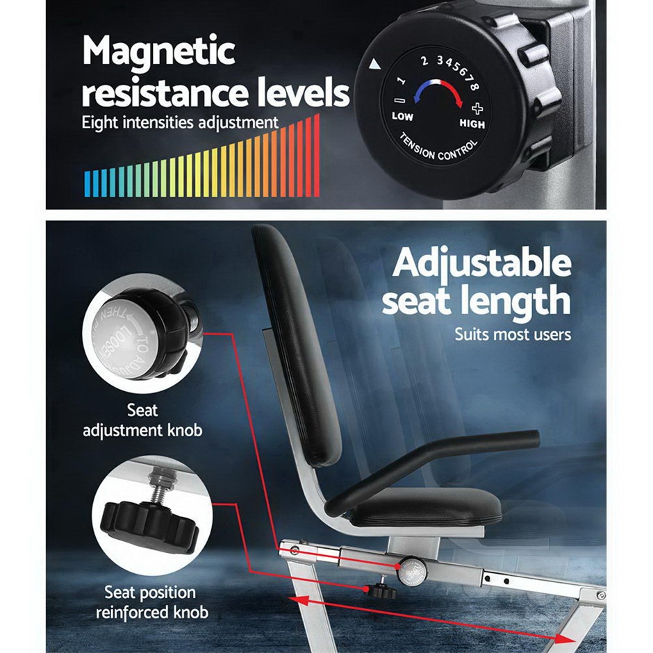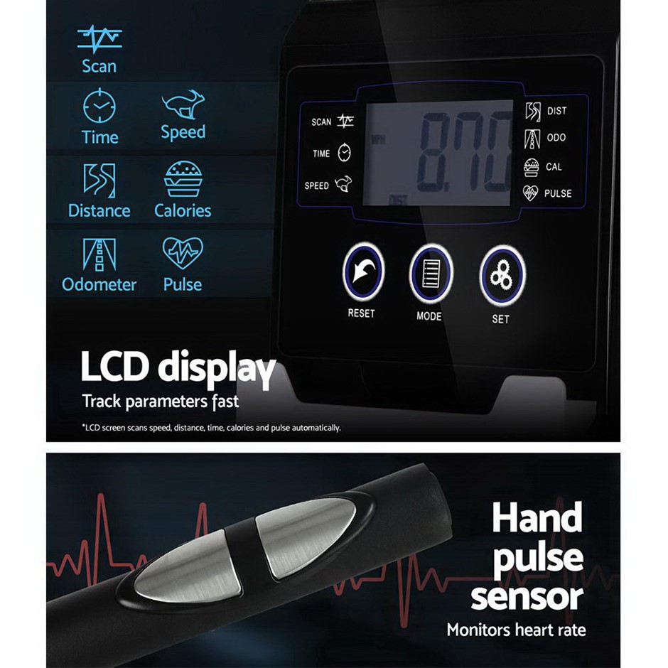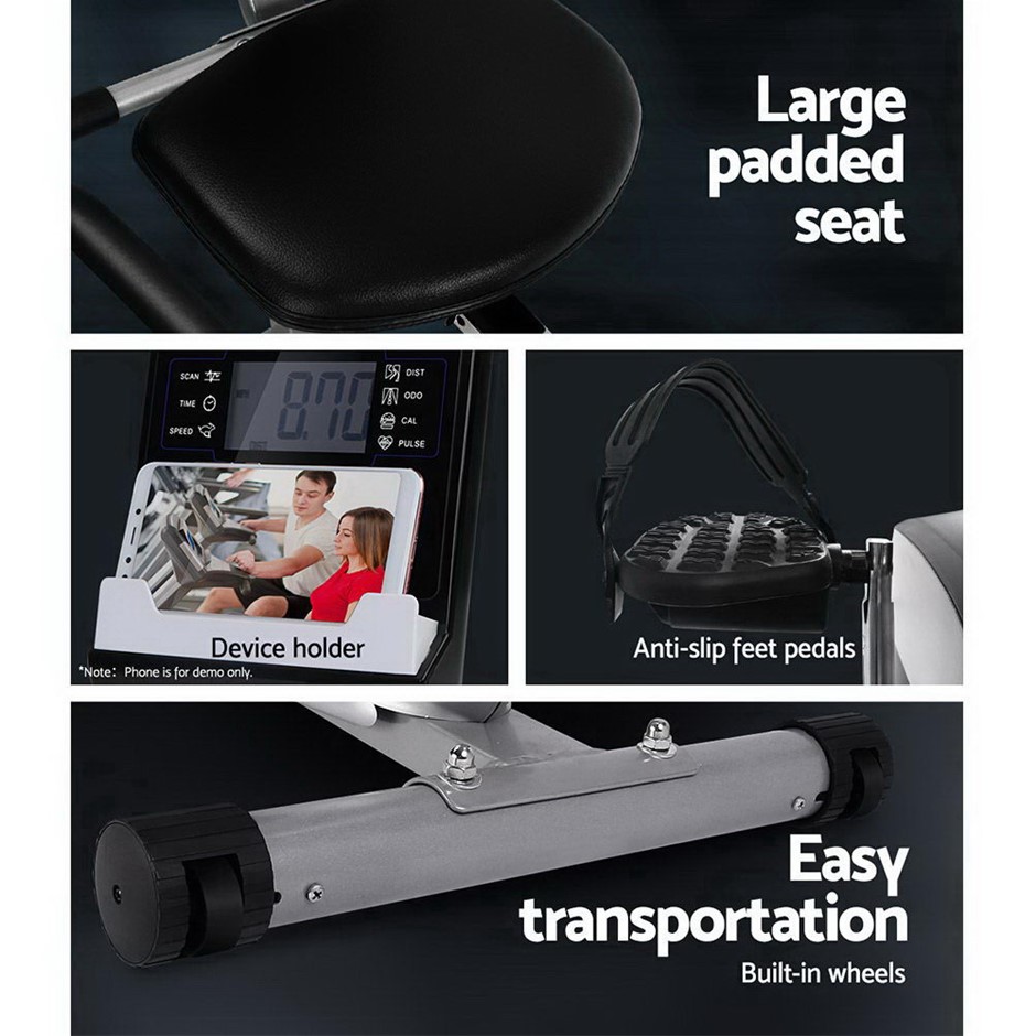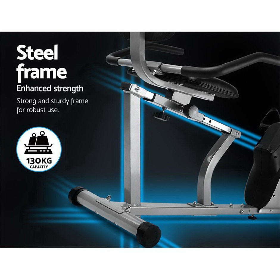 Get an effective workout in the comfort of your home while watching TV or listening to your favourite music. The Everrfit Recumbent Exercise Bike is just perfect to have all these at once. Designed for people who prefer a low or non- impact exercise regime; our recumbent bike provides adequate exercise for the body without causing undue stress and strains on your joints and back. The relaxed seating position actually allows you to balance your body weight better and get your legs and heart to work together in tandem for better blood flow. The LCD display also helps to track parameters easily to let you monitor your health while exercising. The bike itself is constructed of an industrial-strength power-coated steel frame for durability and rust resistance. With up to eight resistance levels; the bike can be adjusted for the desired exercising intensity to suit your workout. Plus; the magnetic flywheel is smooth and runs almost friction-free. Other features include an adjustable seat length; built-in phone/tablet holder; wide and comfortable seat and non-slip protective feet. Not least; the recumbent bike is also easy to transport with two handy wheels for hassle-free moving.