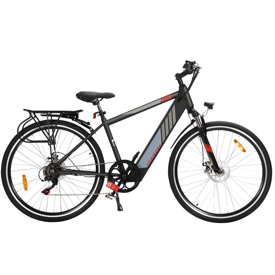 Features27" Phoenix electric bicyclePowerful brushless motorQuality li-ion batteryPortable and rechargeable batterySpeed up to 25km/hRange up to 40km on a chargeAluminium frameSuspension front forkSHIMANO 6-speed gear systemFront and rear disc brakesDurable wheels and tyresLED headlightComfortable seatStorage rack