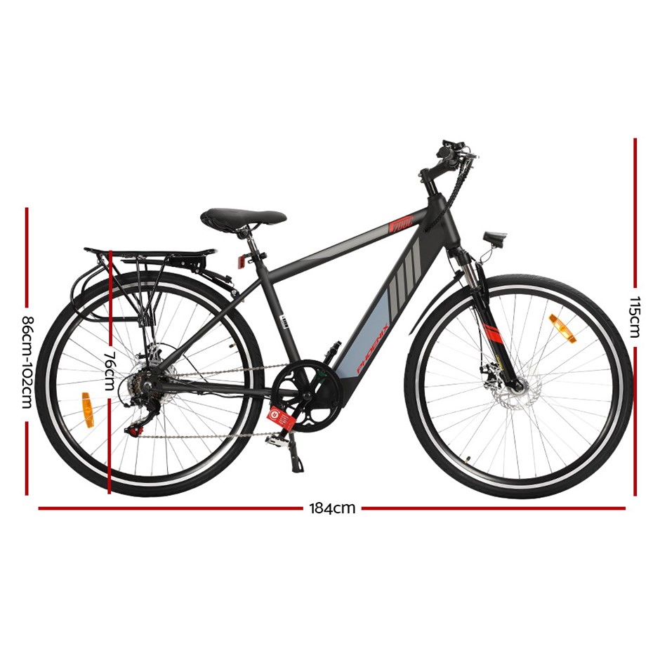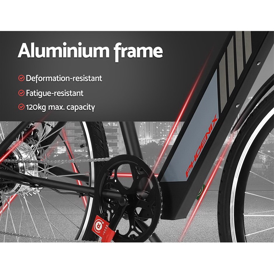 Specifications:Brand: PhoenixFrame: AluminiumHandle: AluminiumBrakes: Front and rear discWheel: 27?Battery: 10Ah 36V li-ion batteryMotor: 250W brushless rear drive motorSpeed: 25km/h (Australian legal speed)Duration: Up to 40km on a single chargeGears: SHIMANO 6-speed gear systemCharging time: 6-8 hoursLoad capacity: 110kgOverall dimensions: 182cm x 115cmx 58cmColour: Black