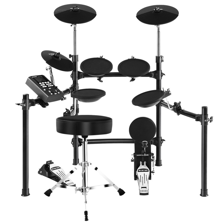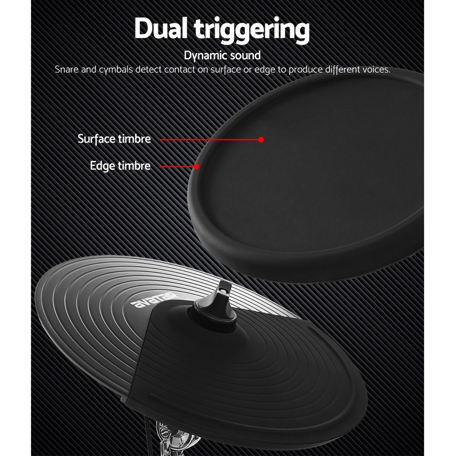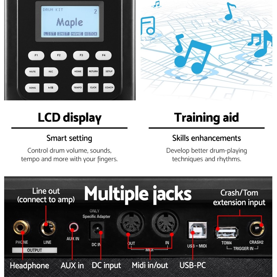 FeaturesReinforced standSilicone surfaceDual trigger for snare and all cymbalsLED display487 voices30 demo tracks30 pre-set drum kitsBuild-in metronomeAdjustable pad and rim sensitivityMidi-USBAUX inBonus drum sticksBonus drum stool (height adjustable)