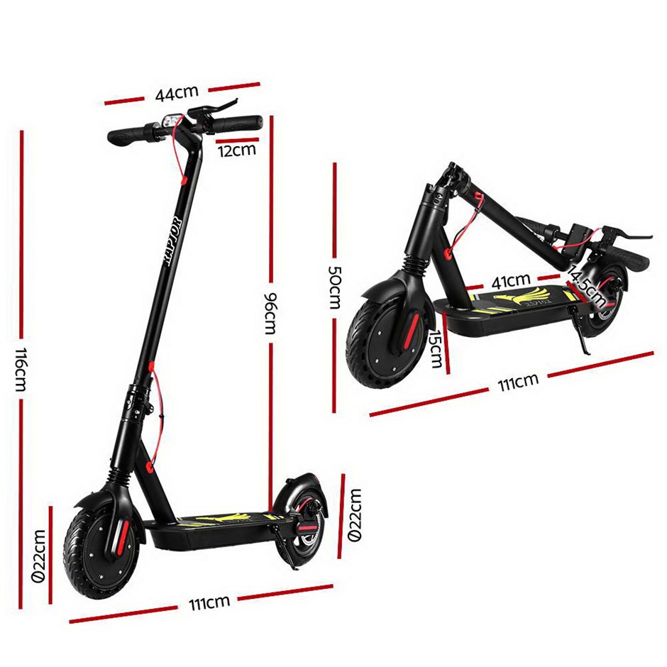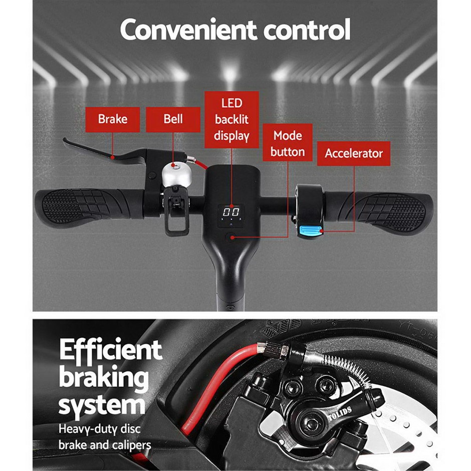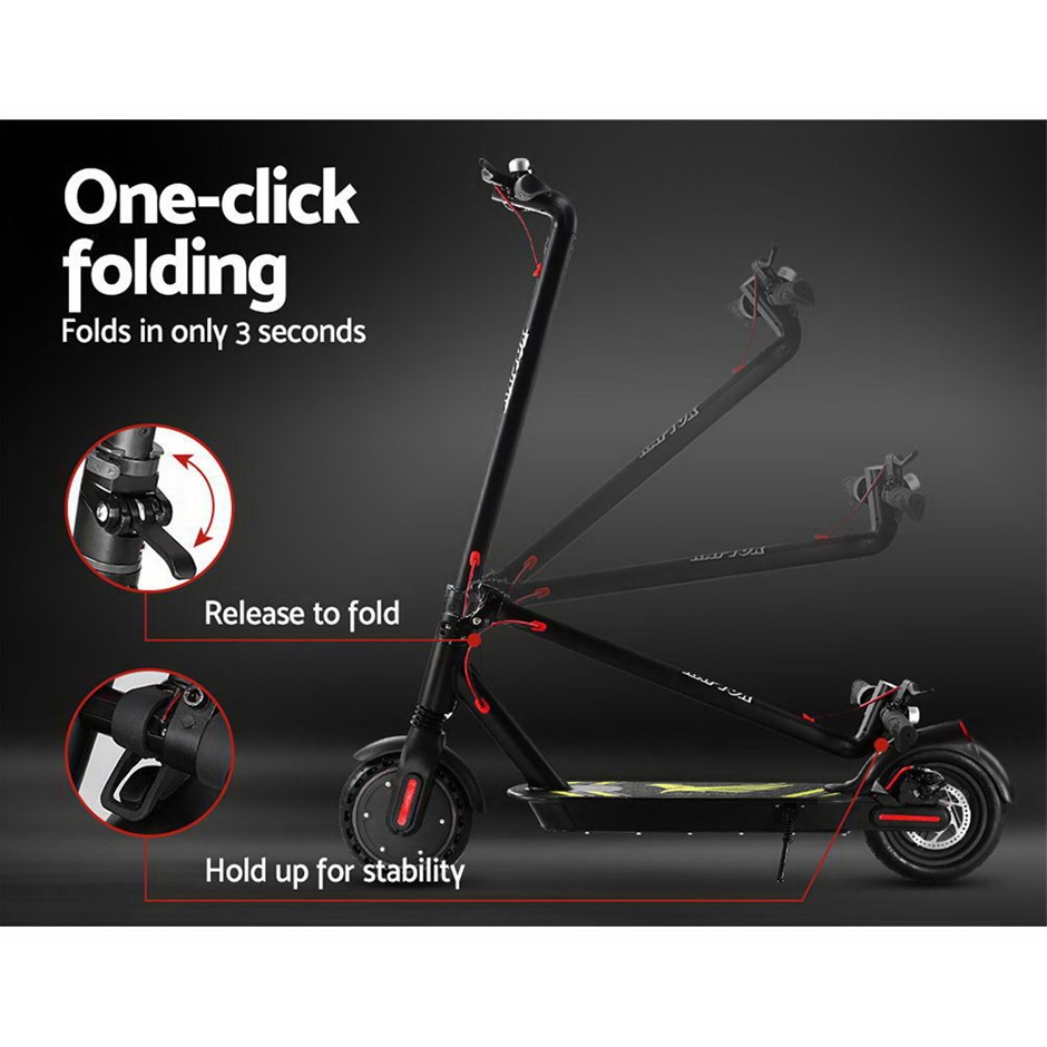 Put the fun back into your journeys with our nimble and fast Electric Scooter. With its aluminium alloy stalk and aluminium deck, the electric scooter can carry up to 120kg with total ease. The powerful 250W motor complies strictly with Australian standards and can reach up to max speed of 25km/h. Plus, the durable and reliable 36V lithium battery can power the scooter up to maximum range of 30km. Better still, the LED display lets you monitor a host of parameters including speed, gear mode, lock signal and battery level. Riding the scooter is just as comfortable too with the foamed handle bar while the skid-resistant deck ensures a steady and safe stance with every ride. And when the riding done, you can easily park the scooter standing-up with the strong kickstand for handy convenience. Safe riding is also enhanced by the ultra-bright headlight and a working tail light that lights up in red whenever the disc brake is applied on the anti-wear and anti-puncture 9.8” pneumatic tyres. Not least, the lightweight 12.7kg electric scooter can be folded up in minutes for easy transport or storage.