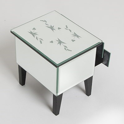 This stunning jewellery box from UniGift's Gallery Collection is both sophisticated and practical. The shining mirrored exterior with a painterly silver olive leaf pattern and faceted glass drawer knobs is complemented by a soft black felt interior lining. Elevated securely on tapered wooden legs and featuring two long drawers, there's enough space to store all your rings, earrings, and small trinkets - with room to spare for future purchases! A tidy and compact storage solution, this UniGift jewellery box makes a stylish addition to any bedroom, wardrobe, or shop.