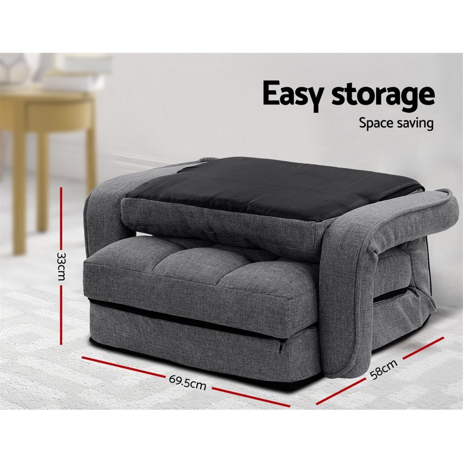 Looking for a personal armchair to relax and do your thing? Traditional armchairs not up to it? Well then, this Artiss Lounge Sofa Bed is just the right one for you. With generous padding upholstered in deluxe linen fabric, our lounge sofa bed is extremely comfortable to sit on. Best of all, it can be adjusted at the head, waist and leg areas to suit your sitting position. Reading your favourite novel, watching TV or having some play time on your portable device, you will definitely appreciate the sofa bed for its pleasant support. Not least, the handy armrests also provide convenient rest and support for your weary arms. And when it is time for have a snooze, the lounge sofa bed easily converts to a comfy bed with an adjustable headrest in just minutes. And unlike traditional armchairs, you can actually fold away the sofa bed for easy storage or bring it to another room to use. Wear-resistant and moisture-proof, the Artiss lounge sofa bed is designed to give you years of longlasting use and comfort for all your pleasurable moments.