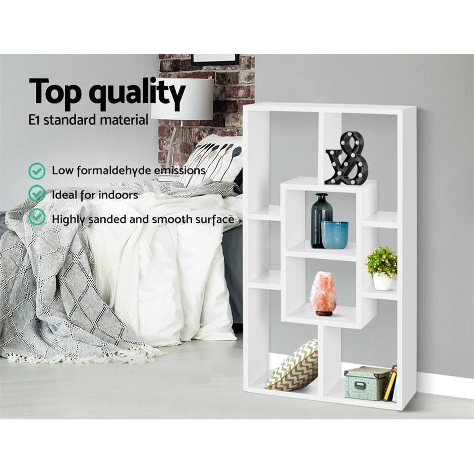 Our Artiss Floating Display Shelf is designed for multiple uses. From a freestanding floor shelf to a wall-mounted floating option, or in horizontal or vertical orientations, the display shelf looks stylish and is practical in every way. The design is simple and timeless and will easily match any d??cor. Plus, the shelf comes with eight partitioned spaces in varying shapes and sizes to fit an assortment of displays to reflect your lifestyle. Use it as a focus feature or as a complementary piece, the 15mm thick particle board display shelf with smooth melamine finish is sturdy and durable and easy to maintain. Features: Floating display shelf Compact and functional 8 display compartments Horizontal or vertical orientation E1 standard material Heavy-duty fixings Safe edges Ideal for displaying books, photos, CDs and more Perfect for any home or office interior Wall-mounted or freestanding Easy to set up *Recommended to mount on solid walls Specifications: Brand: Artiss Material: 15mm particle board Finish: Melamine Overall dimensions: 85cm x 16cm x 48cm Weight capacity: 20kg Colour: White Package Contents: Artiss Floating Display Shelf x 1 Assembly Manual x 1