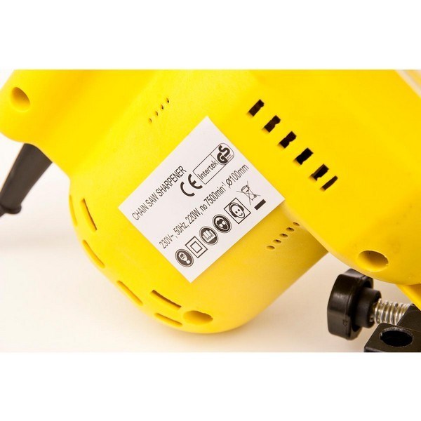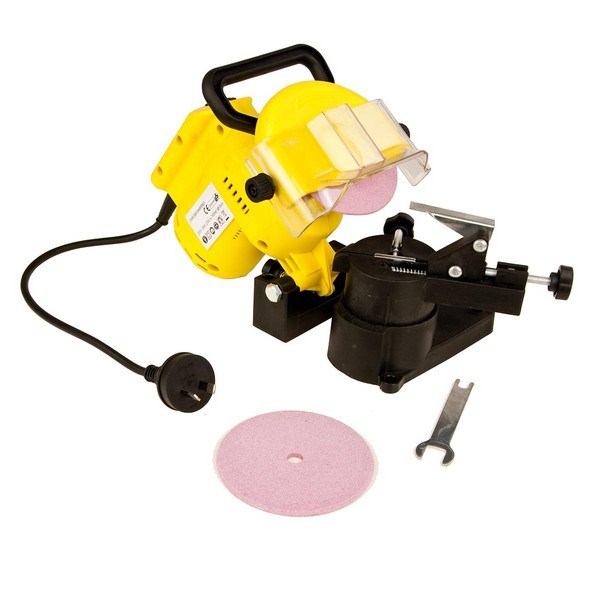 *Powered by a 220W, 50Hz motor which peaks at 320W, grinds almost any chain type and size. The grinder also features a large transparent protective cover, operation handle, pre-drilled holes for bench mounting, an adjustable chain stop, two grinding wheels, max cutting length of 250mm as well as Light - rigid CAD designed construction and a high torque alloy motor..
