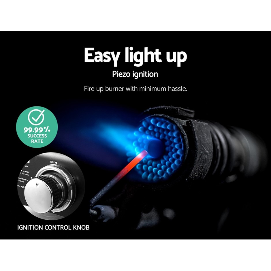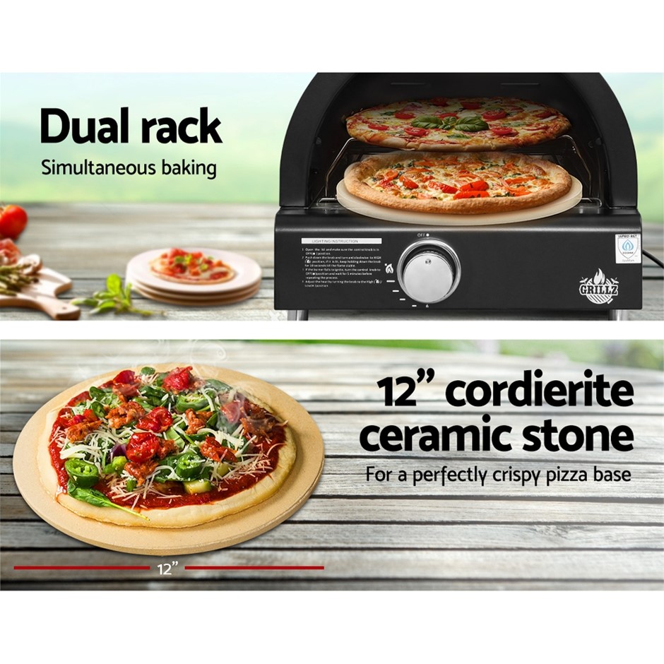 You no longer need to pay the premium at fancy restaurants to eat gourmet pizza with our Grillz Portable Pizza Oven. Now you can cook and enjoy your own gourmet pizza in the comfort of your own backyard or while camping and you can invite as many family and friends as you like, as the dual rack allows you to bake two pizzas at the same time. The cordierite ceramic stone provides the perfect pizza baking surface for a crunchy crust and fluffy insides. The pizza oven is easy to use, as you only need to connect an LPG tank and turn on the ignition. The integrated thermostat means you are always in control of the cooking process while the backward-facing chimney directs heat and smoke away from you and keeps your eyes tear-free. And you do not worry about the aftermath, because the stainless-steel drip tray and detachable door make for easy cleaning.