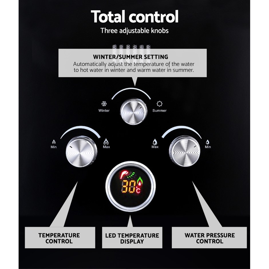 Easy to install, the Water Heater can heat up to 480L of water per hour at your preferred temperature setting conveniently shown on the LED display. No worries about getting accidentally scalded too as the Heater has a built-in processor that sets the maximum water temperature at 50°C. Together with a host of other great safety features, the variable flow shower head is also designed to automatically ignite or turn off the burner by a simple on/off trigger.
