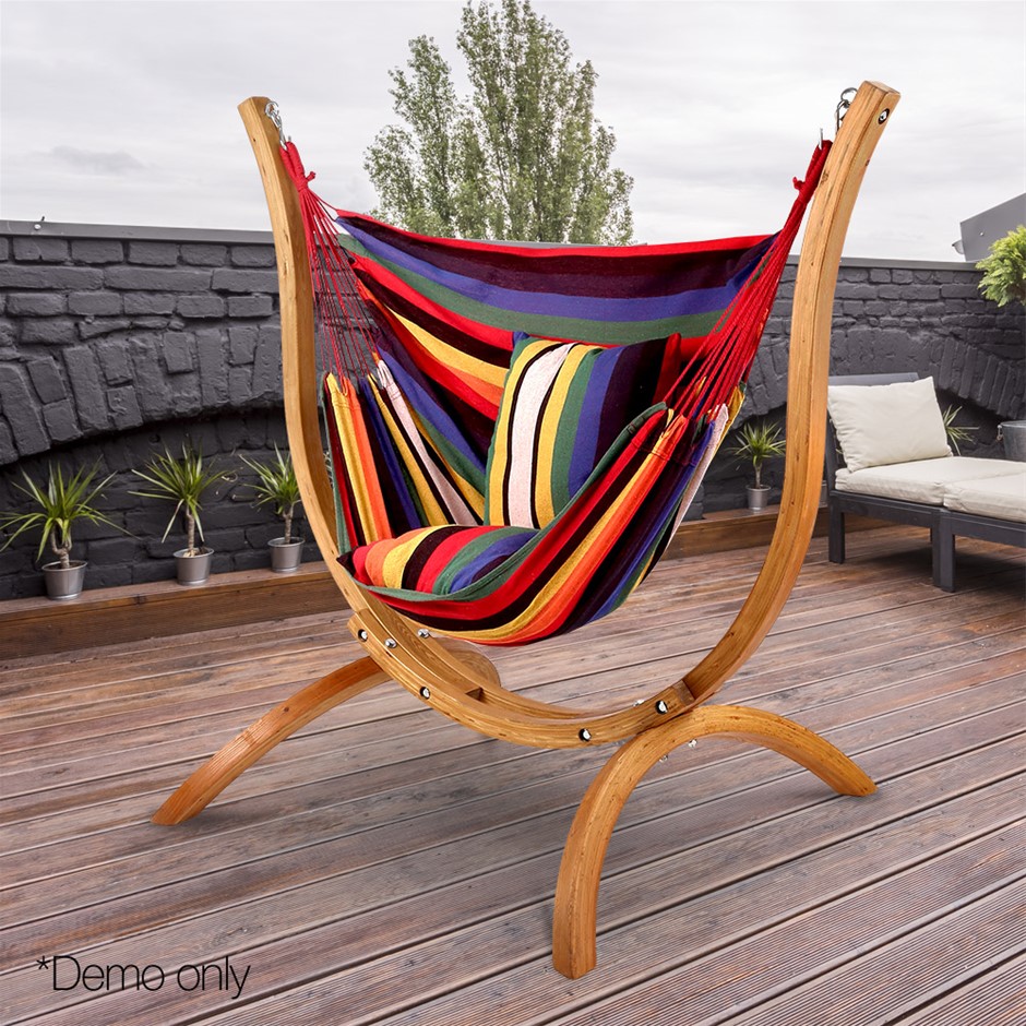 Set your life to relax mode with the Gardeon Timber Hammock Chair. Built to exacting standards of durability and workmanship, the Hammock Chair is a joy to use and so cool to chill out in. Have it indoors or outdoors, for a perfect resting spot or as a peaceful reading zone, the Hammock Chair is designed to give ample support for your body. The wood used is Larch wood which is imported especially from Russia and the colourful stripe-pattern polyester cotton blend canvas is no less exceptional for its lasting qualities. Two soft matching cushions come as standard to let you enjoy the relaxing moments even better. Forget about the ordinary and sit back into something extraordinary with the Gardeon Timber Hammock Chair. Get yours today.