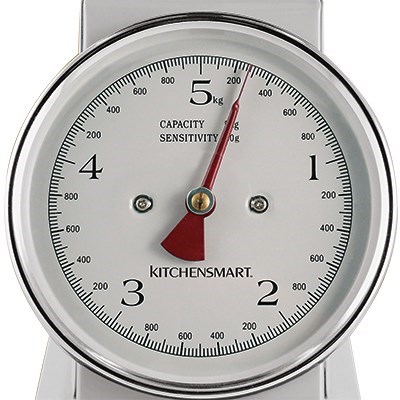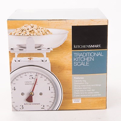 Ensure your ingredients weigh up to the recipe with the KitchenSmart 5kg Traditional Mechanical Kitchen Scale in white. Ideal for all cooks in any kitchen, these classic kitchen scales feature a stainless bowl so your food items can't escape, stainless steel tray and strong metal body and fittings for durability and style, a large, easy to read dial and a weight capacity of 5kg. Displaying the weight in 20 gram increments, the KitchenSmart 5kg Traditional Kitchen Scale is the ultimate companion to your kitchen benchtop.
