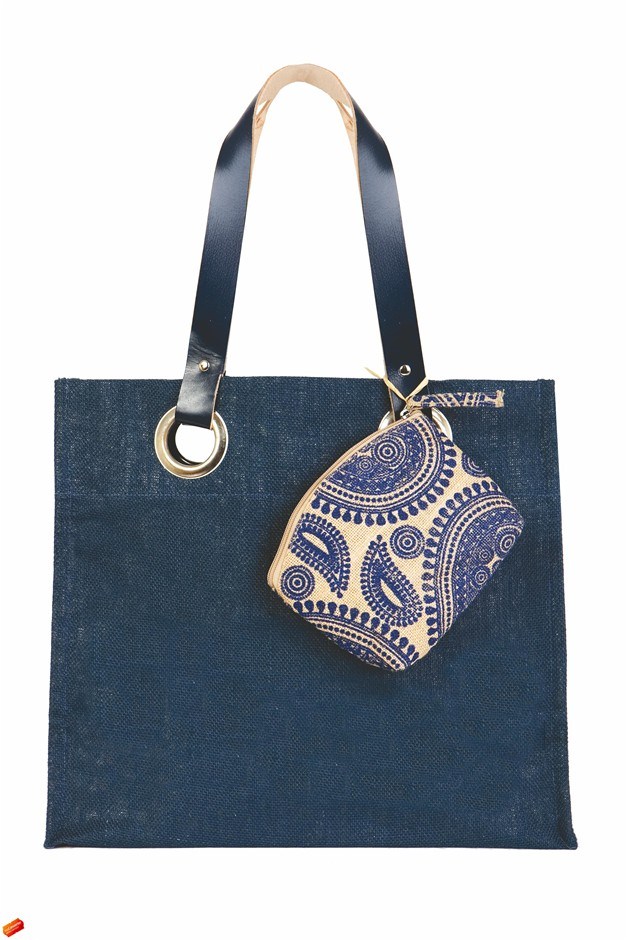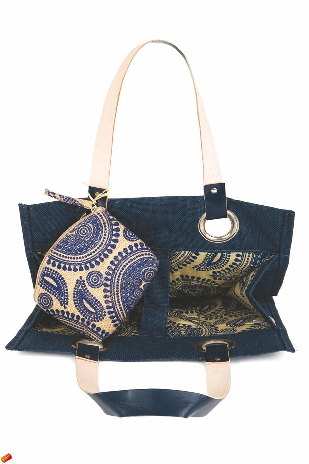 Natural jute with inside patterened cotton lining and magnetic closure. Firm base, oversized eyelits with natural leather shoulder straps. Small internal pocketFeatures: