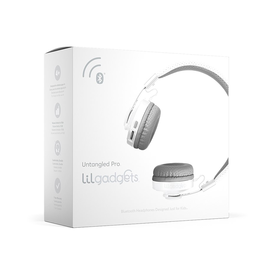 LilGadgets Untangled Pro Children's Wireless Bluetooth Headphones - White - UNTANGLED PRO. Recommended for ages 4+. Receiver range: approximately 30 ft. Battery life: 12 hours in use | 180 hours standby | WERCS certified. Includes 4 ft premium nylon braided 3.5 mm audio cable with inline microphone DESIGNED FOR SHARING – THE SHAREPORT - Our beloved Share Port feature allows multiple headphones to be connected to one device, no splitters or special cables needed. SoftTouch material allows for rugged durability, a delicate feel and comfortable fit. Studio-grade 40 mm drivers render sound more clearly, enabling lower volume levels. Polycarbonates designed for strength and ability to maintain lustre over time. Industrial-grade stainless steel retains shape and provides high wear and fatigue resistance. SAFETY FIRST - All of our headphones and earphones are volume limited to 93 dB. Our products comply with the CPSC’s strict Standard Consumer Safety Specification on Toy Safety.