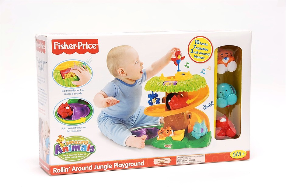 Get ready for lots of rolling, spinning, bouncing, teetering, musical fun! Three roll-along animal friends love to slide down the curvy ramp. Drop them through the tree trunk and they'll pop out below to take a spin on the carousel. There's a swinging monkey, bouncy bird, bat-at roller and lively music and sounds.