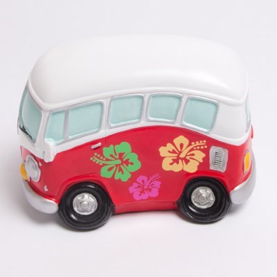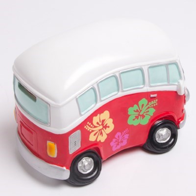 This fun kombi van money box is sure to impress! It comes in a detailed design, complete with hibiscus flower decorations on each side, and a Volkswagon logo on the front. In red and white colours, with green, orange, pink, blue and yellow details, this bright money box is sure to add interest to your bedroom or living area.