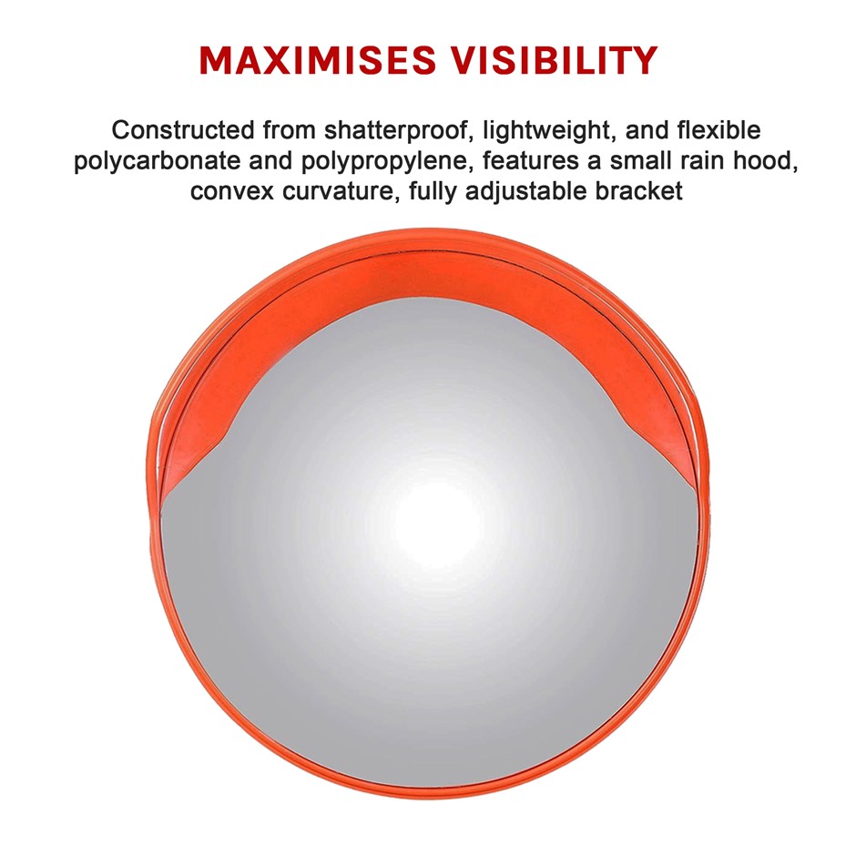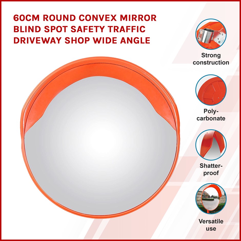 This 60-centimetre convex round blind spot mirror by Randy & Travis Machinery helps to prevent accidents by reducing blind spots in parking garages, driveways, alleys, factories, hospitals, warehouses, or streets. Its convex, wide-angle surface increases the range of vision, allowing drivers and pedestrians to see and avoid hazards ahead, even when there is an obstructed view.