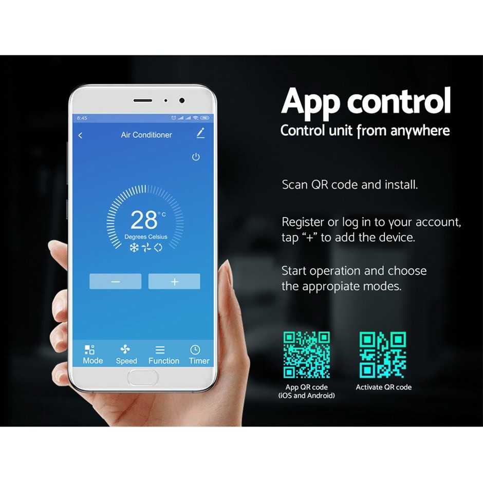Features Perfect for rooms sized 20m² to 30m² Wi-Fi connectivity 3-in-1: air con, dehumidifier, 4-speed fan LED display screen Remote control 24-hour timer Automatic water vaporisation system Outstanding heat dissipation Quiet operation Energy-efficient High-performance twin motors Built-in handles and castors Simple installation Window exhaust piping and fitting included