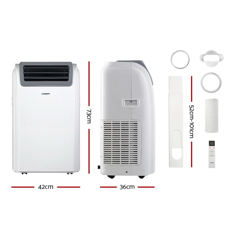 Hot days are not too far away. So why not pick up our Devanti Portable Air Conditioner to help you stay cool comfortably and economically throughout the season. The air conditioner is three appliances rolled into one: air conditioner, 4-speed fan and dehumidifier. There is also an additional automatic water vaporisation system so that you do not need to empty the water tank. The air conditioner rapidly delivers super cool breezes throughout rooms sized 20m² to 30m². In whichever mode you are using, you can always count on ample cool air at your preferred temperature settings. The LED display allows for a clear glance of all your settings. A handy remote control lets you control the settings from the comfort of your lounge, while the Wi-Fi connectivity truly lets you take control from anywhere. The air conditioner can also be set to work for a pre-set number of hours with its 24-hour timer. Built-in handles and castor wheels make the air conditioner very portable so that you can keep cool wherever you are. An included adjustable window exhaust kit enables easy installation of the exhaust hose for hot air to be extracted easily. Do not let the heat and wet get you down this summer. Rise up to a cool and refreshing ambience with our portable air conditioner.
