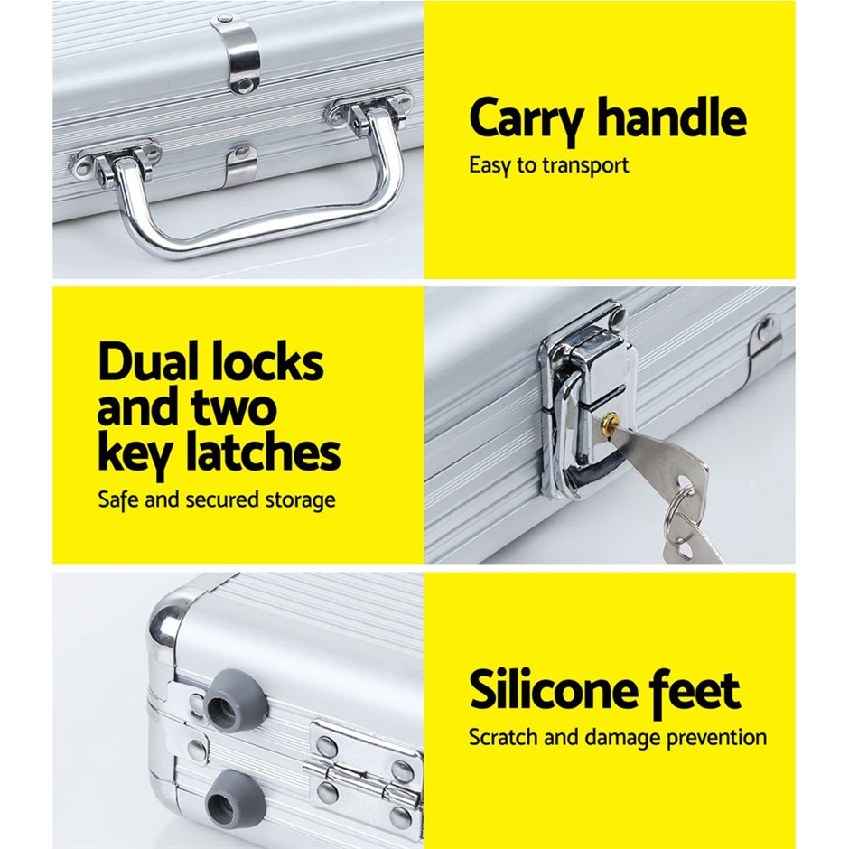 Specifications:Poker chipsMaterial: PS plastic and steel insertedChip Thickness: 3.3mmChip Weight: 11.5gButton: 3 (Dealer, little blind, big blind)Pieces: 1000 (200 pieces each of black, blue, green, red and white chips) Colour: Black, blue, green, white, redDicesNumber: 6Colour: Red Playing cardsSets: 3Lockable caseMaterial: Aluminium alloyKeys: 2Size:56 x 21 x 7cmTotal weight: 14.4kg