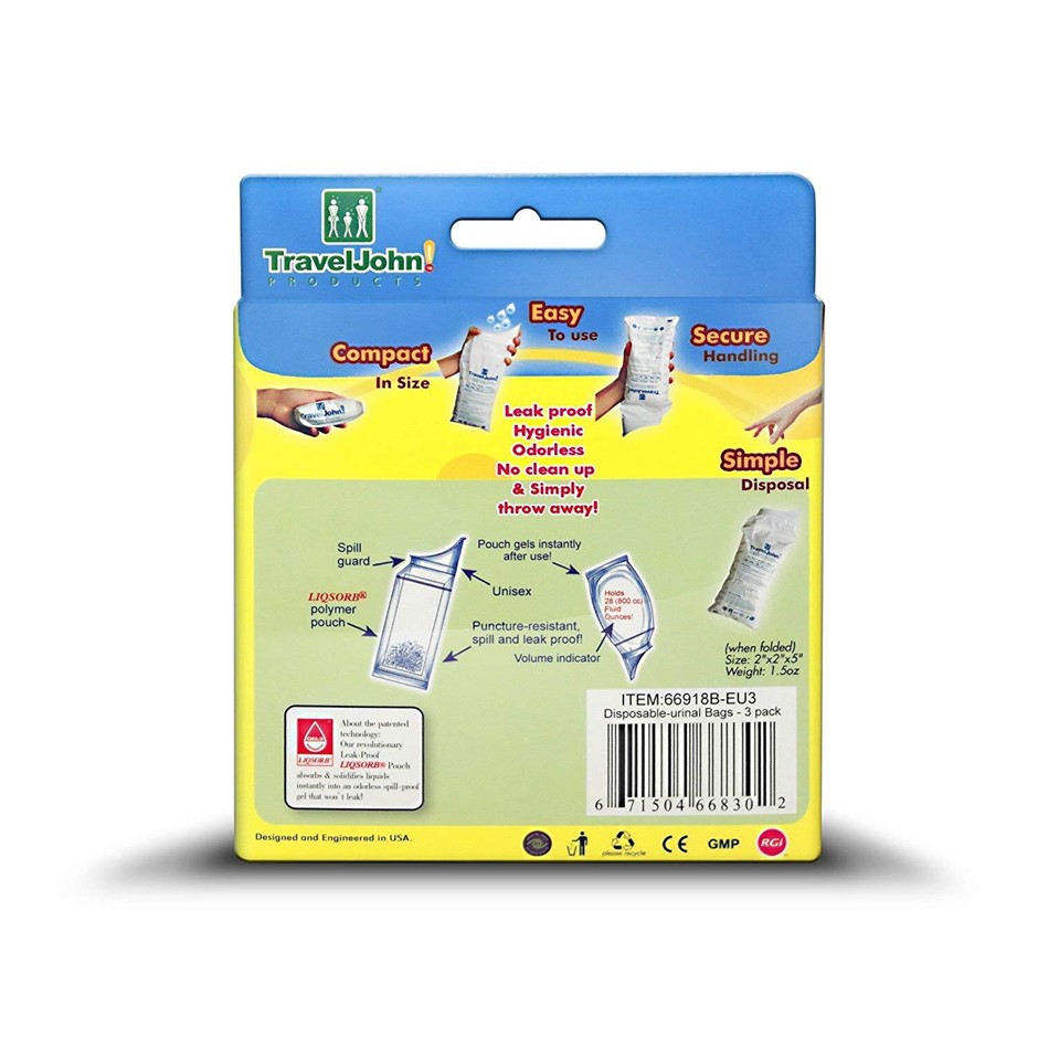 TravelJohn disposable urinal is convenient, sanitary, discreet and compact. The key ingredient is LIQSORB, a combination of an exclusive biodegradable non-woven fabric pouch containing a biodegradable polymer substance that immobilises bacterial growth quickly - absorbs the liquid waste and turns it into an odourless, spill-proof gel bag that is non-toxic and wastes disposal safe.