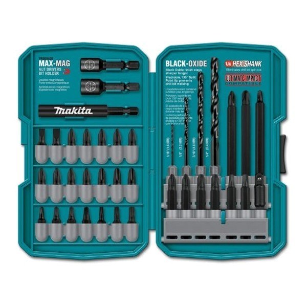 • Makita's new 38 drill and driver accessory set is compatible with all drills and impact drivers. It has a black oxide finish which resists corrosion and extends bit life. The black oxide finish stays sharper longer.