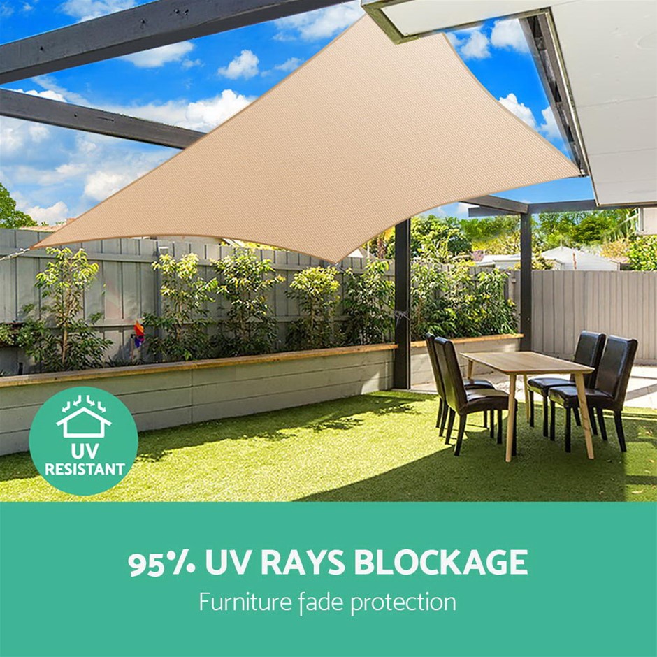 Made of 280gsm commercial grade shade cloth and a Marine grade 8mm stainless steel buckle on every corner with 38mm webbing; this strong shade sail provides high durability and a longer life performance. Providing up to 95% UV blockage for your backyard and constructed with a heavy-duty and weather resistant material, the shade sail will provide you with a welcoming outdoor living space all summer long.