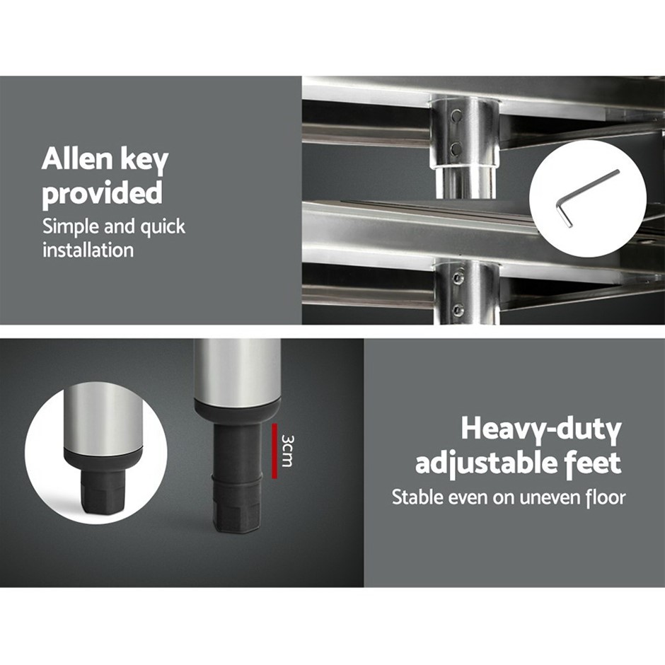 Our Stainless Steel Work Top is finished in commercial grade 430 stainless steel which makes it ideal for use in homes, cafes and restaurants. This bench, with much more space, is wider than the standard one in our stores. The treated bench edges provide extra safety working around the table while the adjustable bottom shelf allows you more height options for storage. Everything is held together firmly with the help of the included allen key for quick and easy installation. And if the floor is uneven, the adjustable legs can make things right with ease.