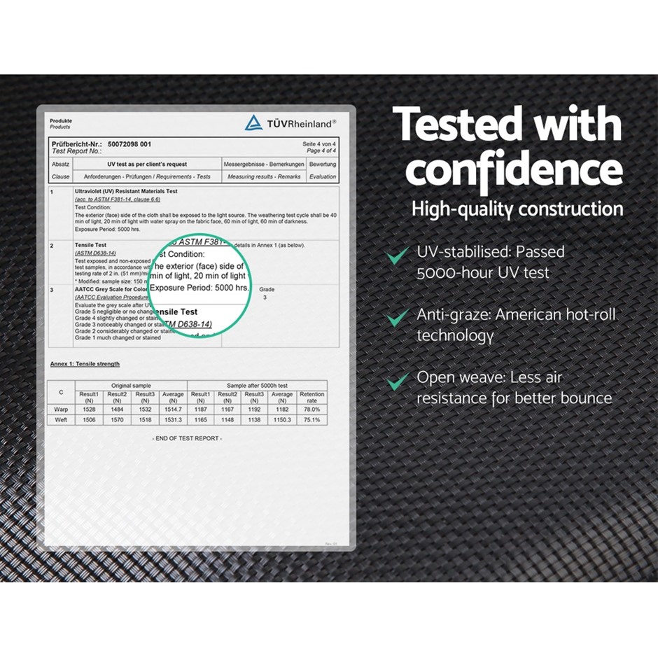 Features16ft spacious trampolineHeavy-gauge steel frameworkRust-proof marine-grade galvanizationSuperior bounce and water resistanceAnti-graze mat with 5000hrs UV test20mm thick UV-stabilized paddingWide UV-stabilized spring skirtTriple-rate springsEnclosed safety nettingSafe double-lock zip-and-clip entryBonus storage compartmentsBonus basketball set