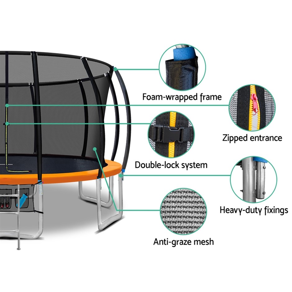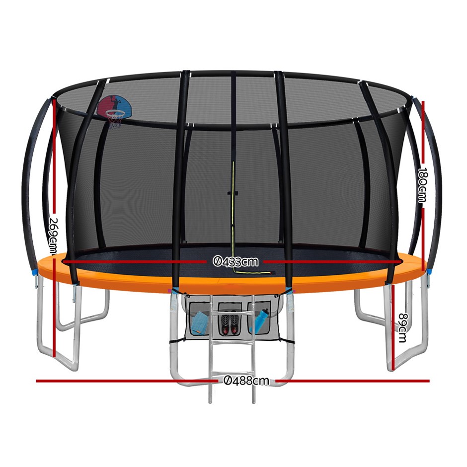 Bounce to your heart’s content with the Everfit Trampoline. With its superior bounce characteristics featuring 108-piece triple rate springs, the 16-foot Trampoline enables safe and durable bouncing with no worries. The heavy-gauge steel framework is designed to handle all robust play and is UV-tested for quality and reliability. Other great features include a curve design for more rigidness, 20mm thick padding, anti-graze mat, safety netting and a double-lock zip-and-clip entry. Not least, the included basketball hoop, basketball and pump really adds an awesome fun factor to the entire ensemble.