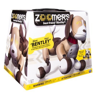 Zoomer is back! He's twice as smart, twice as funny and will steal your heart twice as fast! With 2X the tricks, you can teach Bentley everything a puppy needs to know. Call his name, help him learn and watch how excited he gets when you reward him with a real good belly scratch. Kids can run, play and laugh as Zoomer excitedly wags his tail and responds to their commands. Zoomer is smart as a whip and understands English, Spanish and French. He even follows your movement with his cute puppy eyes. Teach him twice as many tricks and before you know it he'll be laying down, rolling over, chasing his tail and much more! And with his all-new friends Bentley and Shadow (sold separately), there's a whole line of Zoomer pups waiting just for you! Just like real dogs, they love to play, bark and interact with one another. When you adopt Zoomer into your home he can't help but feel like a real part of the family. Bring home the smartest pup around with Zoomer Robodog 2.0 - Bentley!