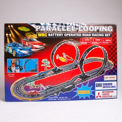 Kids will have hours of fun playing with this Parallel Looping racing track set! Measuring over 5 metres in length with two big looped sections, this racing track is sure to give drivers an adrenaline rush. It comes complete with two toy cars: the Subaru Impreza WRC racer and the Mitsubishi Lancer WRC racer. A fun way to spend a rainy day indoors, this road racing set is a must-have item that's sure to impress.