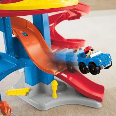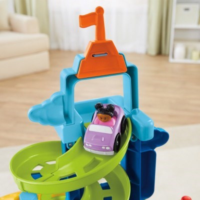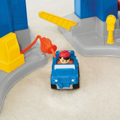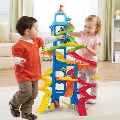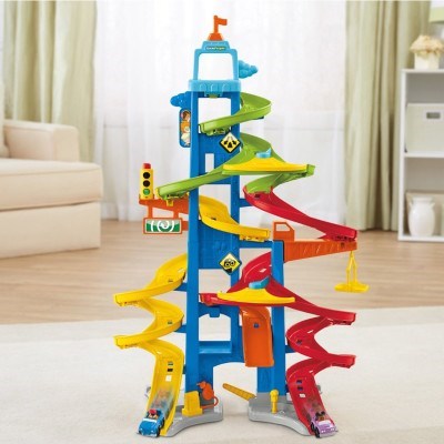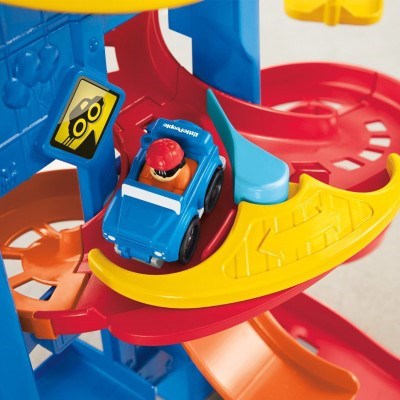 Standing over 3 feet tall, this playset ramps up the zipping, zooming racing fun! Your little racer sends a vehicle down the ramp at the top, then waits for the surprise finish as the car comes out at the bottom in one of three spots. Will it speed out one of the two side exits or jump off the middle ramp? It’s different every time! The creative play is revved up even more with a realistic crane, stop sign, gas pump and parking meter. Your little one will enjoy hours of non-stop action!