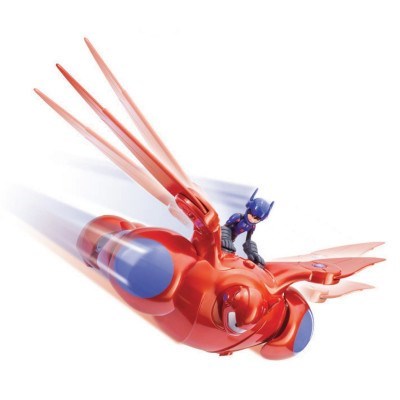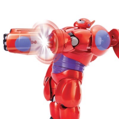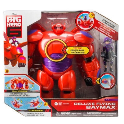 Large and in-charge, this massive Baymax action figure is ready to fly into battle using all his great weapons and features. Towering at 11" tall with a soaring 18" wingspan, the Deluxe Flying Baymax features 20 points of articulation, multiple lights, sounds and other fun features such as a launching rocket fist. Baymax also comes with a 4.5" Hiro Hamada figure, which when attached to Baymax's back, unlocks additional flying sounds that change depending on whether Baymax is flying up or down.
