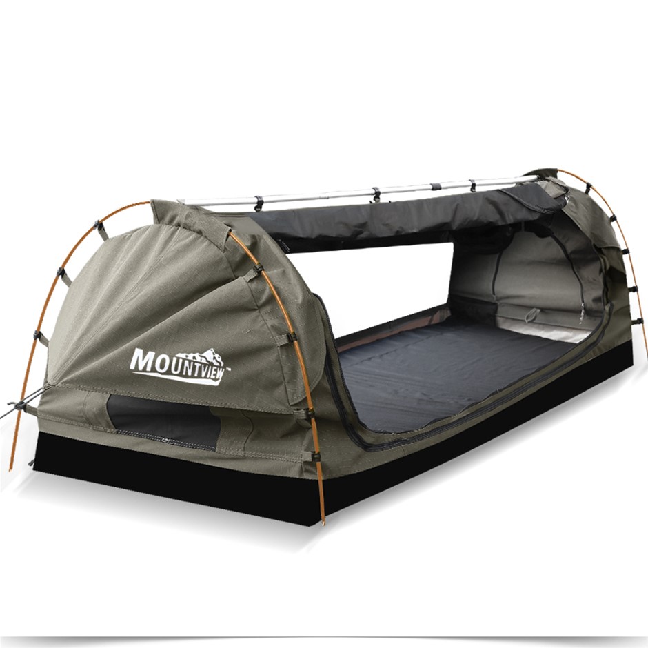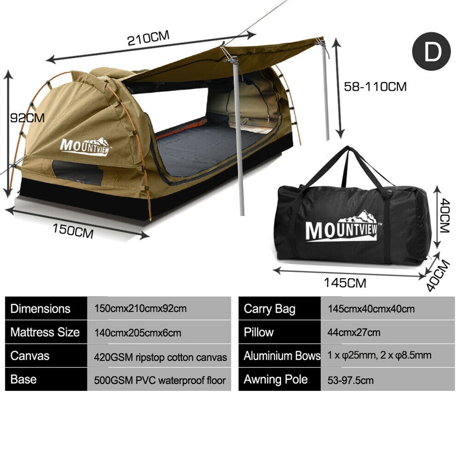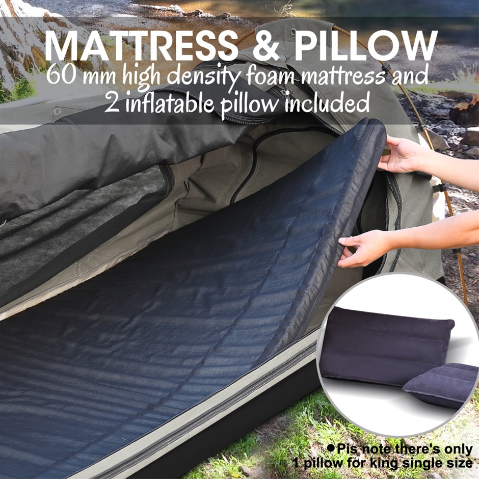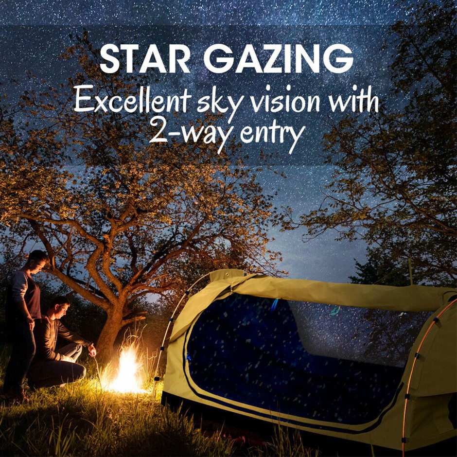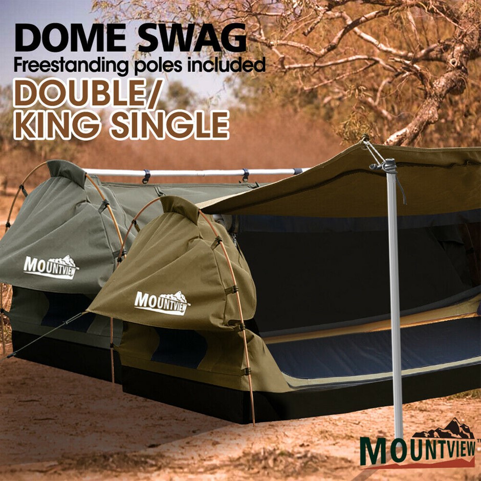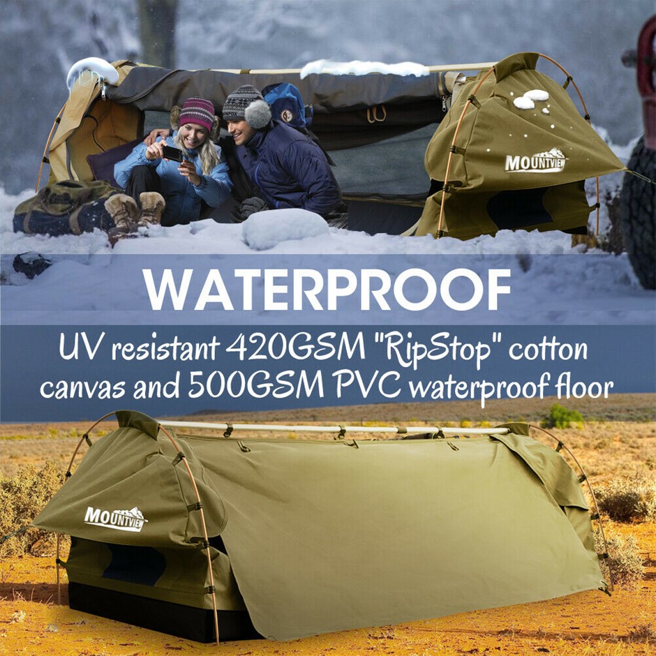 Explore more for outdoor living with Mountview Camping Swag. 380GSM water-repellent rip stop canvas cover, 500gsm PVC flooring and an extra 10cm high edge, it is suitable for each season. Fully enclosed for privacy with zipped openings for fresh air anytime. Mesh panels allow you to have excellent sky vision and keep insects out. High density mattress with 6cm thickness designs for better sleep on any surface. Thick aluminum support poles hold up the entire tent firmly. In addition, you will get inflatable pillows, pegs, guide ropes, carry bag and all the extras that make your camping experience unforgettable.