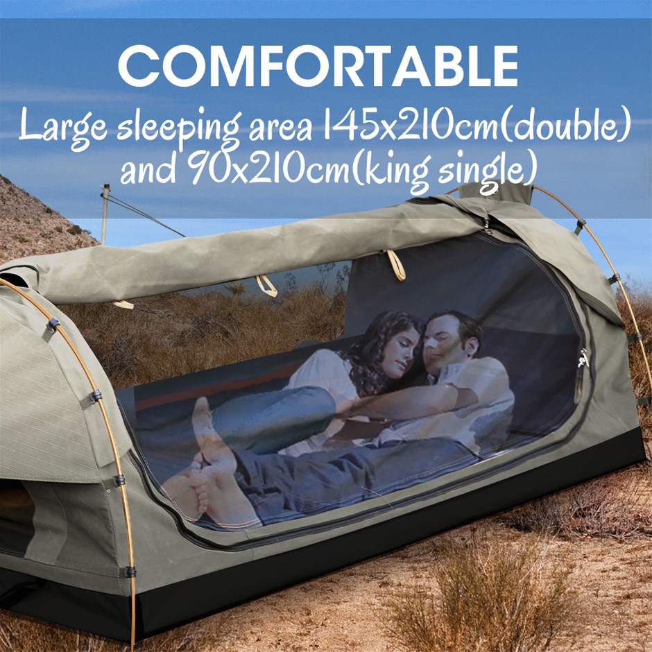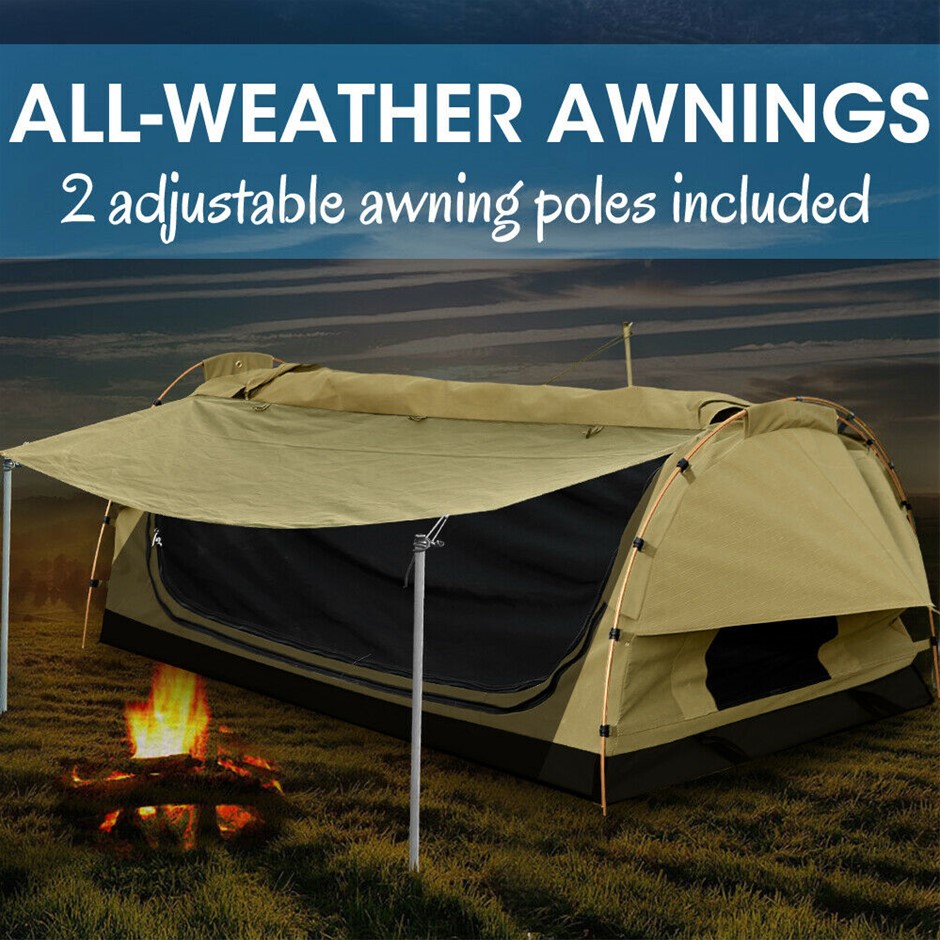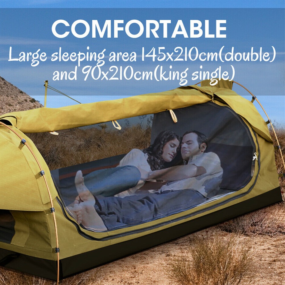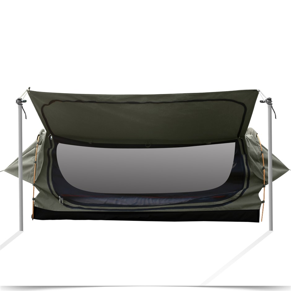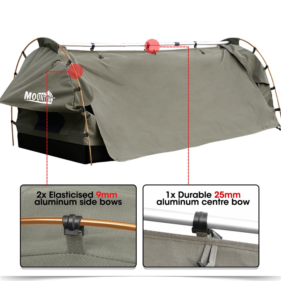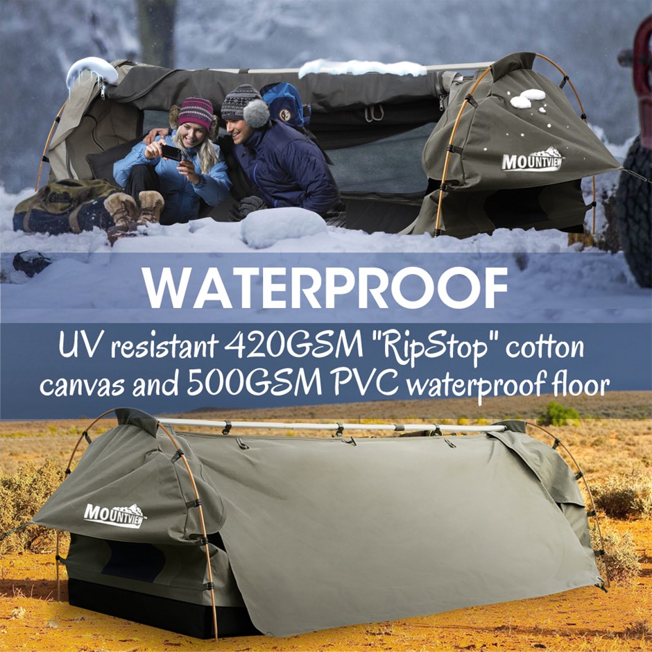 Explore more for outdoor living with Mountview Camping Swag. 380GSM water-repellent rip stop canvas cover, 500gsm PVC flooring and an extra 10cm high edge, it is suitable for each season. Fully enclosed for privacy with zipped openings for fresh air anytime. Mesh panels allow you to have excellent sky vision and keep insects out. High density mattress with 6cm thickness designs for better sleep on any surface. Thick aluminum support poles hold up the entire tent firmly. In addition, you will get inflatable pillows, pegs, guide ropes, carry bag and all the extras that make your camping experience unforgettable.