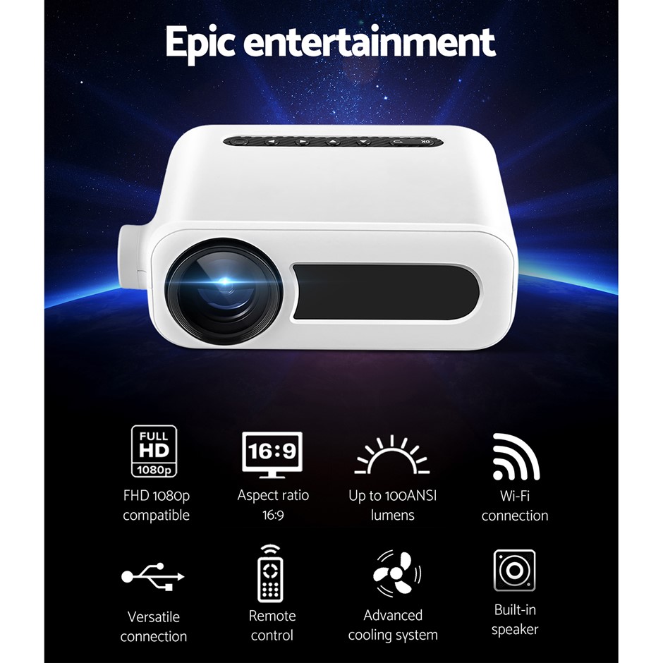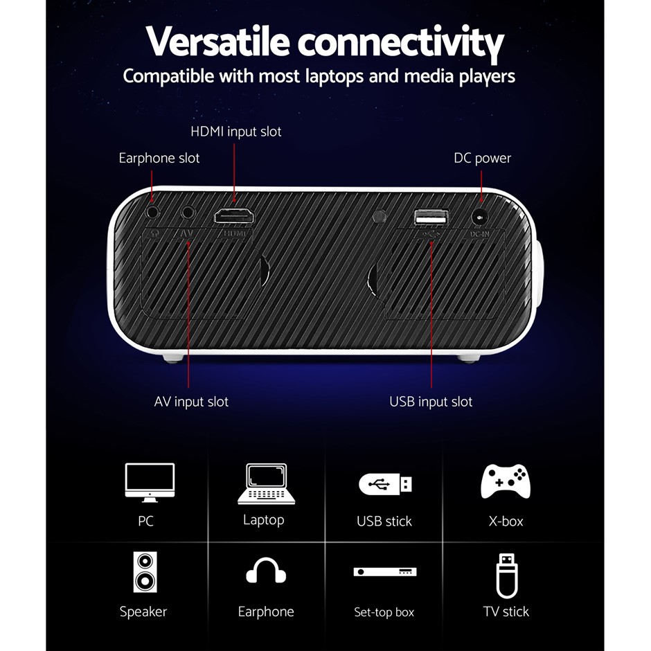 From the small screen to the big screen, now you can enjoy epic entertainment with our Devanti Video Projector. With its ultra-expansive colour gamut, the projector delivers crisp clear images with more brilliant colours to give you the best viewing experience. The projector is compatible up to 1080p, so you won’t have to compromise on quality. Using Wi-Fi connectivity, our video projector effortlessly supports screen casting from your iPhone, iPad, smartphone, tablet or laptop, so you can stream content cable free. It also features a built-in heavy bass speaker and a high-lumens lamp with a lifespan of up to 30,000 hours. For even more entertainment value, the projector includes HDMI, USB, AV and 3.5mm audio ports for fast connection to multiple devices such as external speakers, game consoles and hard disks. Get the home cinema experience and order today! Include remote control and additional AV audio cable.