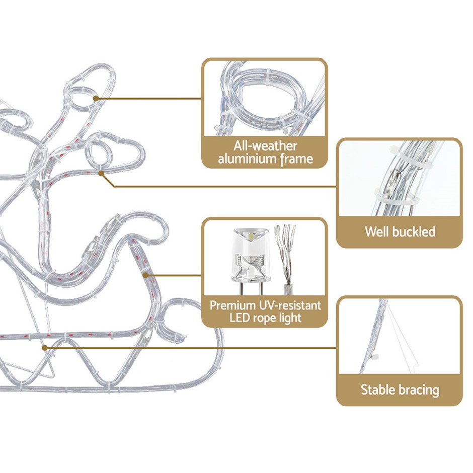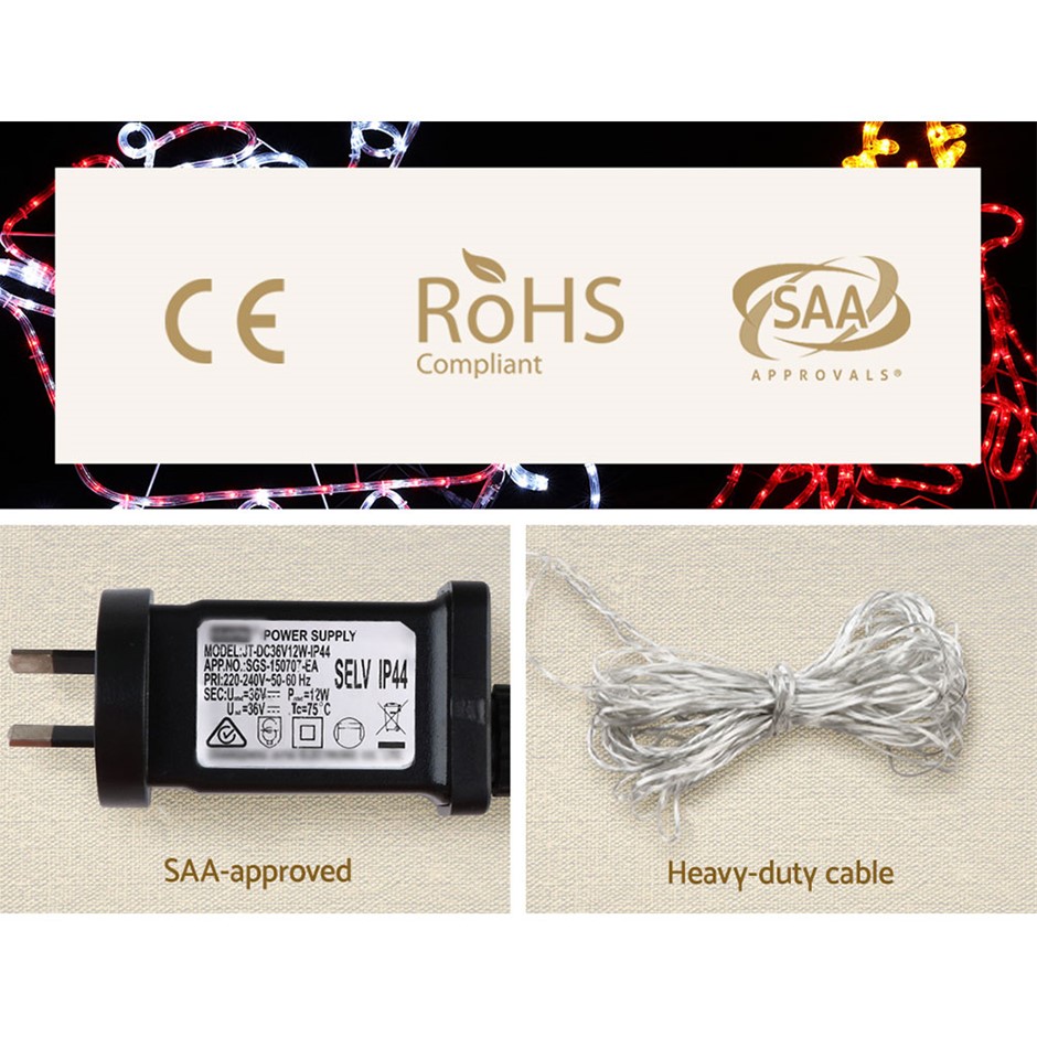 Bring the brilliance of Christmas to your home with our Jingle Jollys LED Santa on Sleigh Light. Featuring strings of super-bright energy-saving LED lights, the UV-resistant rope light is set in an all-weather aluminium frame shaped as Santa Claus and adorable reindeers pulling his sleigh. There are eight flashing effects that you can cycle through for a truly brilliant light display and the long power cable gives you more flexibility on where you can set up the light. You can place it indoors in shopping centres, or outdoors on your front lawn for all your neighbours to appreciate. And you do not need to take the light down as soon as Christmas is over. It is water-repellent and weather-resistant, so you can leave it out well into the New Year. Create a lively and bright Christmas ambience throughout the season.
