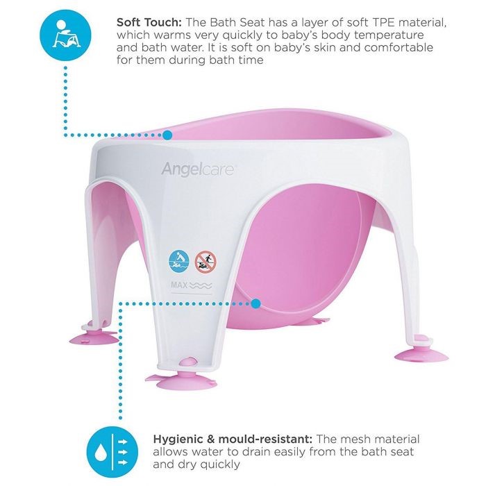 Once babies start to sit up and reach between 6 to 10 months of age, the Angelcare Baby Bath Seat is the perfect bath time solution.Made from lightweight, durable plastic, the Baby Bath Seat allows the baby to be comfortable and supported while free to explore and play.The clever, ergonomic design features drain holes for easy rinsing and extra strong suction cups for excellent stability.Parents have the choice of bathing or showering their little one, secure in the knowledge the Baby Bath Seat will help to look after the baby.FEATURES:
