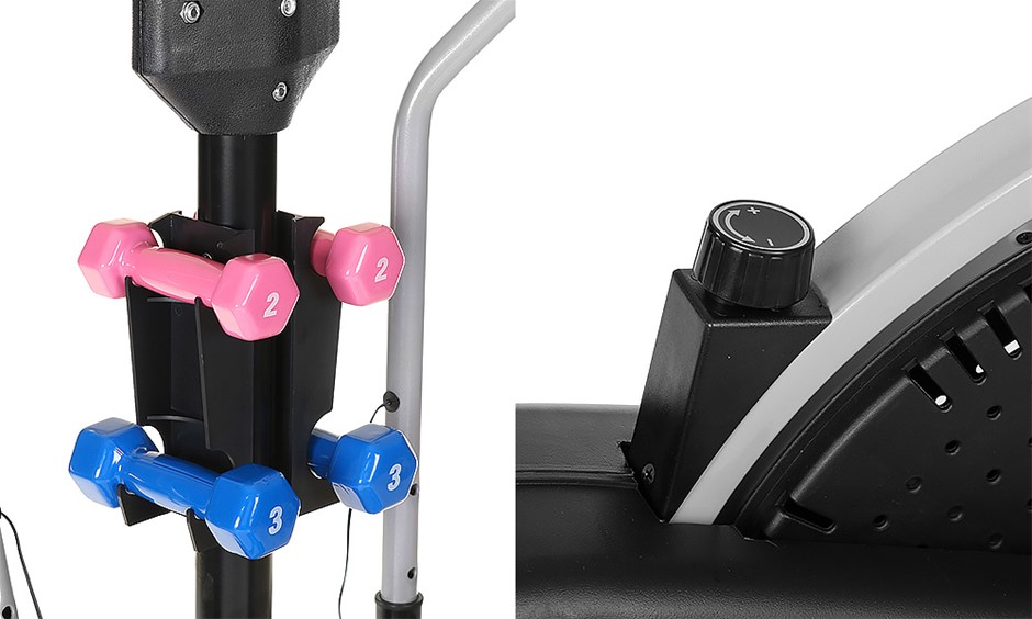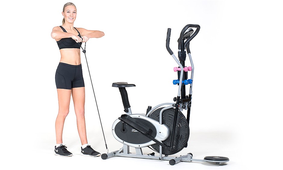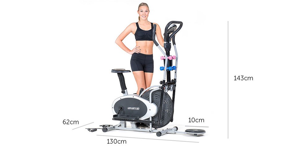 Your own quality home gym... A revolution in home gym equipment - have an elliptical trainer and an exercise bike for the price of one.Save space and save money while getting maximum results.Reversible movement: This elliptical bike features a fully reversible movement which allows you to target a whole new muscle group as you push backward. Tone your legs like no other machine on the market!Computer functions: Push your personal best using the on-board computer which displays duration in time, speed, distance, heart rate and even a rough guide on calories burned.Don't put off getting in shape any longer, take the first step with the PowerTrain multi-function elliptical bike today!Weight Twist Disc: Cross trainer bike also features a weight twist disc attachment which is perfect for improving muscle tone, circulation, flexibility an d mobility. Twist your way to slimmer abdominal , glutes and quadriceps.Dumbbell Set: Your purchase includes two dumbbell sets (2lbs and 3lbs) made of iron and coated with vinyl coating for maximum comfort and grip. Training with dumbbells can help you achieve your fitness goals more effectively.Resistance Bands: It also features resistance band attachments, which enables to greatly enhance range of exercises that can be performed during single workout routine.Please note: Couriers deliver to the building entrance only and may require your assistance unloading from the vehicle.FEATURES: