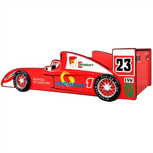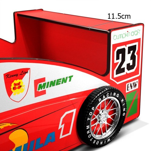 This beautiful-looking Racing Car Bed is perfect for your child, whether you are planning to replace his/her old bed or give a new present. It also gives you a great hand if you are training your child to sleep alone at night. Your child will probably jump into bed straight away rather than avoiding it. The bed is designed in the shape of a Formula 1 car, and painted beautifully thoroughly with a high gloss finish. It is equipped with a rear spoiler which can be used as a top shelf, plus four 3D tyres and wheels for that sporty look your child will love.