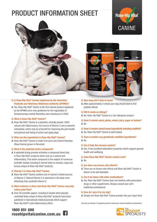 Rose-Hip Vital Canine is a 100% natural anti-inflammatory that may be of benefit for improving the joint health and general well-being of active and ageing dogs. It is also a powerful antioxidant, a rich source of vitamin C, and is safe, scientifcally proven and registered by the APVMA. The unique property of Rose-Hip Vital Canine is the special patented compound which is activated during the patented drying process, causing it to act as natural anti-inflammatory. Rose-Hip Vital Canine is made from 100% pure and natural Rosehip fruit with no additional additives. Rosehip is also known to contain one of nature??s most natural sources of Vitamin C. NOTE: Use in pregnant and lactating animals is not recommended as safety has not been established. Do what??s right by your dog with Rose-Hip Vital. Dosage and Administration: Mix with food once daily. One level scoop (included) = 2.5 g Body weight up to 15 kg - 2 scoops daily for 3 weeks - then 1 scoop daily Body weight 15-30kg - 4 scoops daily for 3 weeks - then 2 scoops daily Body weight over 30kg - 6 scoops daily for 3 weeks - then 3 scoops daily SIZES: 150g; 500g