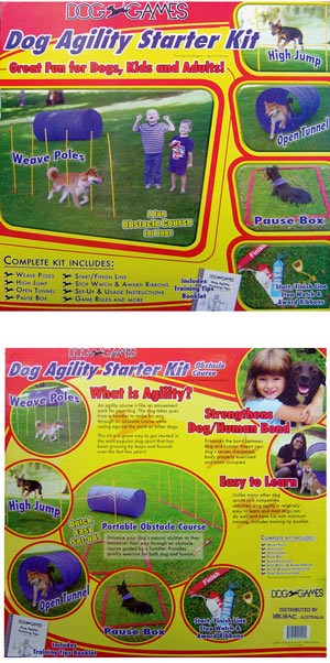 Great fun for dogs, kids and adults! Includes weave poles, high jump, pause box, open round tunnel, start/finish line, stop watch and award ribbons, setup and usage instructions, game rules and more. Click image to see larger pictures.