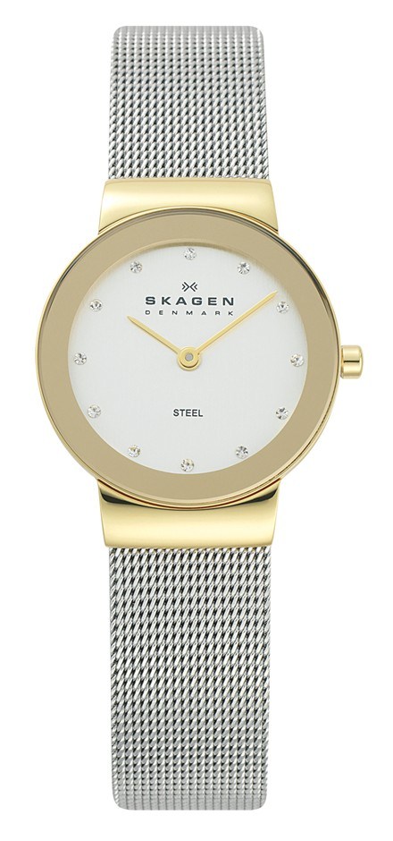 This Skagen ladies watch has a smooth minimalistic design. It has a white dial with attractive Swarovski set indices. The signature Skagen stainless steel mesh band connects to a round gold ion-plated stainless steel case and mirror border.
